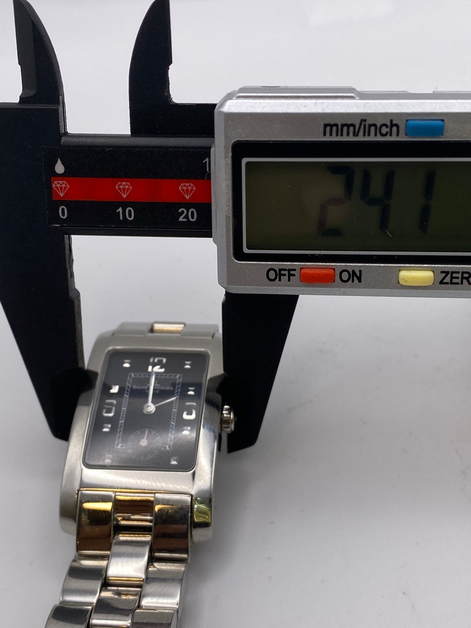 Now available is this Baume & Mercier quartz stainless steel dress watch. This watch features a black dial with unusual silver tone hour indexes. It has a quartz movement that has been time-tested and is running exceptionally well. As you can see, the case and glass have some slight marks, but nothing that compromises the watch's wearability or structure. This watch is not sold as water-resistant; keep it away from water.
