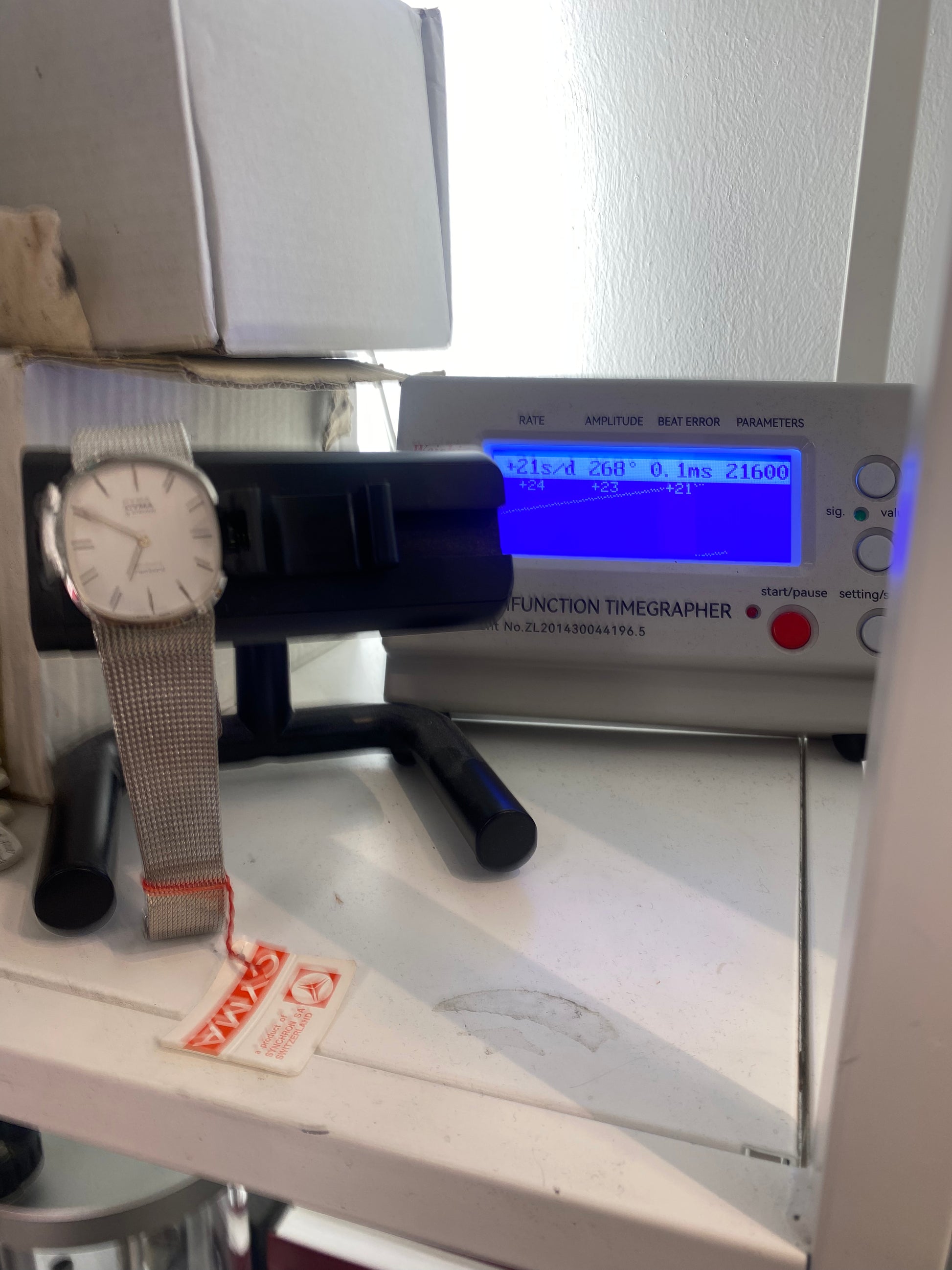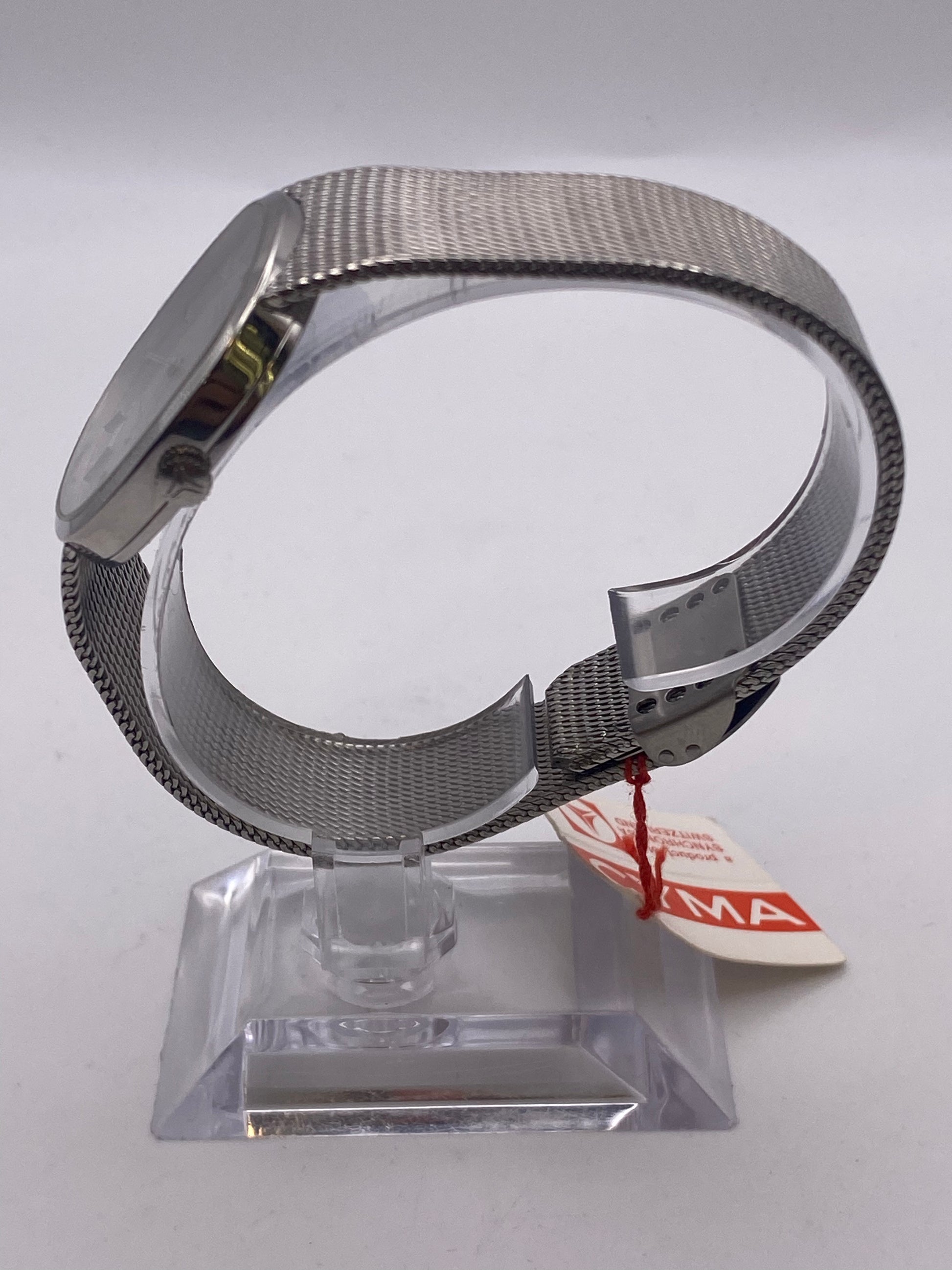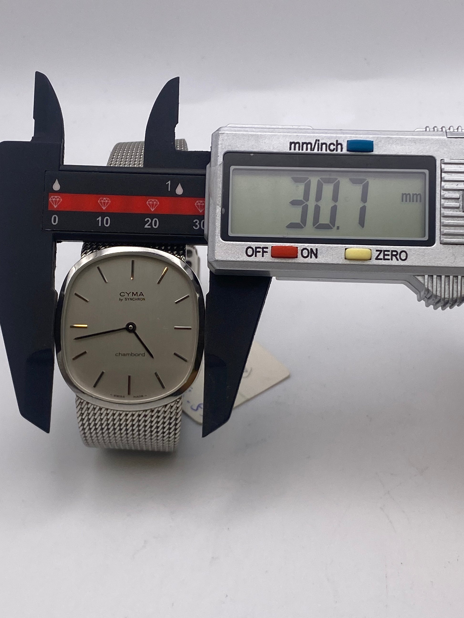 Now available is this stunning vintage Cyma Chambond manual wind mechanical gents dress watch. This watch has a striking silver dial with silver tone black inlayed hour markers and hands. It has a manual wind mechanical movement that has been time-tested and is running well. As you can see, the case and glass have some slight marks, but nothing that compromises the watch's wearability or structure. This watch is not water-resistant; keep it away from water. This watch is mechanical so will not be as accurate as a modern day quartz watch or smartphone.