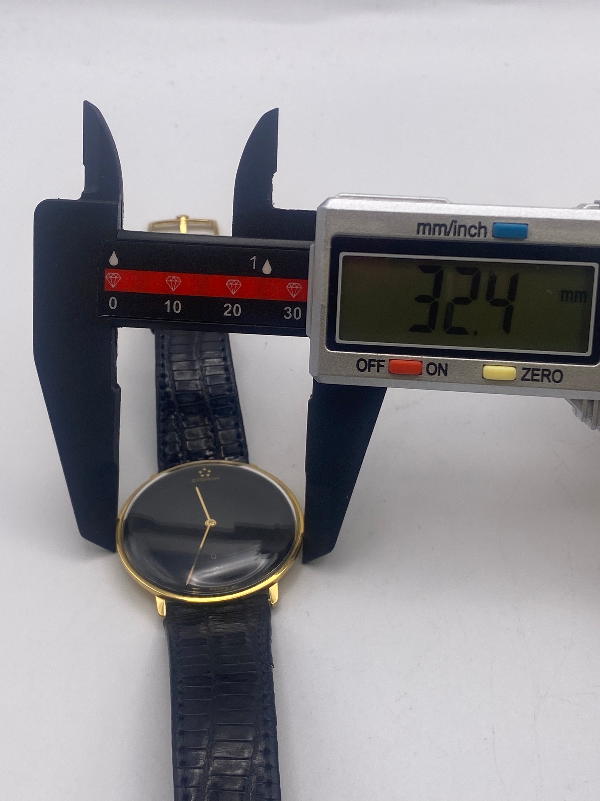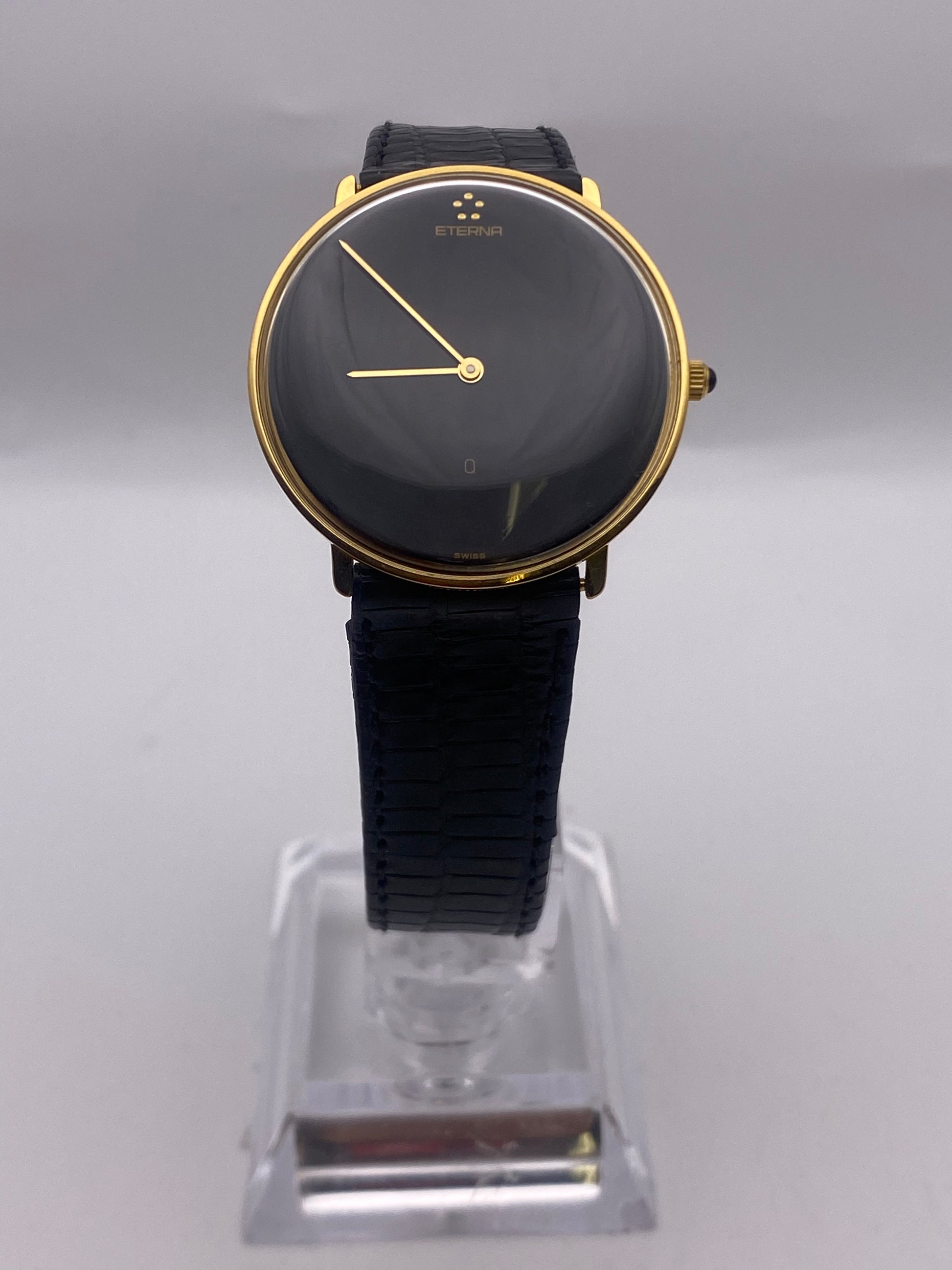 Now available is this stunning vintage Eterna gold plated gents dress watch. This watch features a beautiful gloss black onyx dial with gold tone hands. It has a quartz movement that has been time-tested and is running exceptionally well. As you can see, the case and glass have some slight marks, but nothing that compromises the watch's wearability or structure. This watch is not sold as water-resistant; keep it away from water.