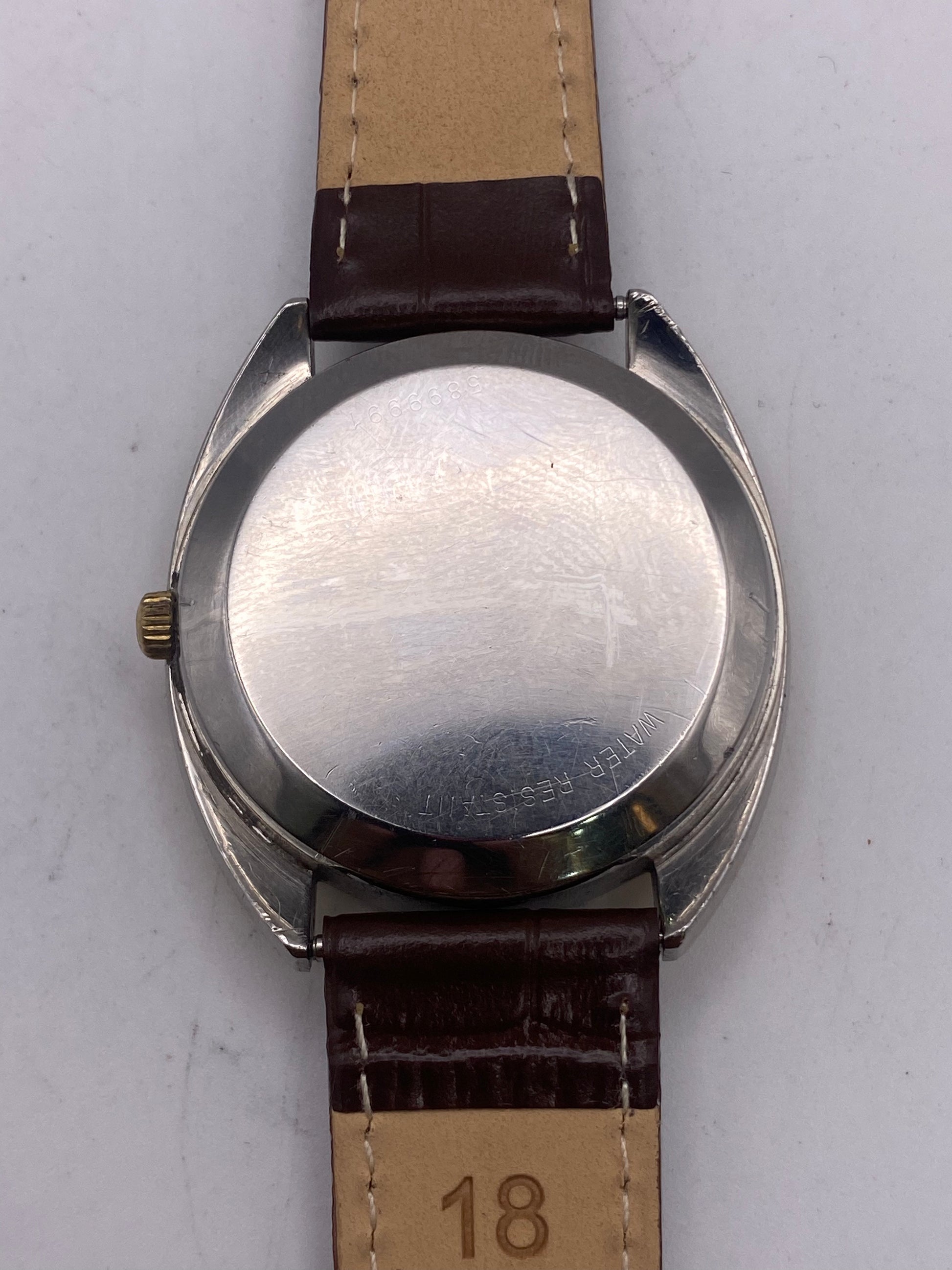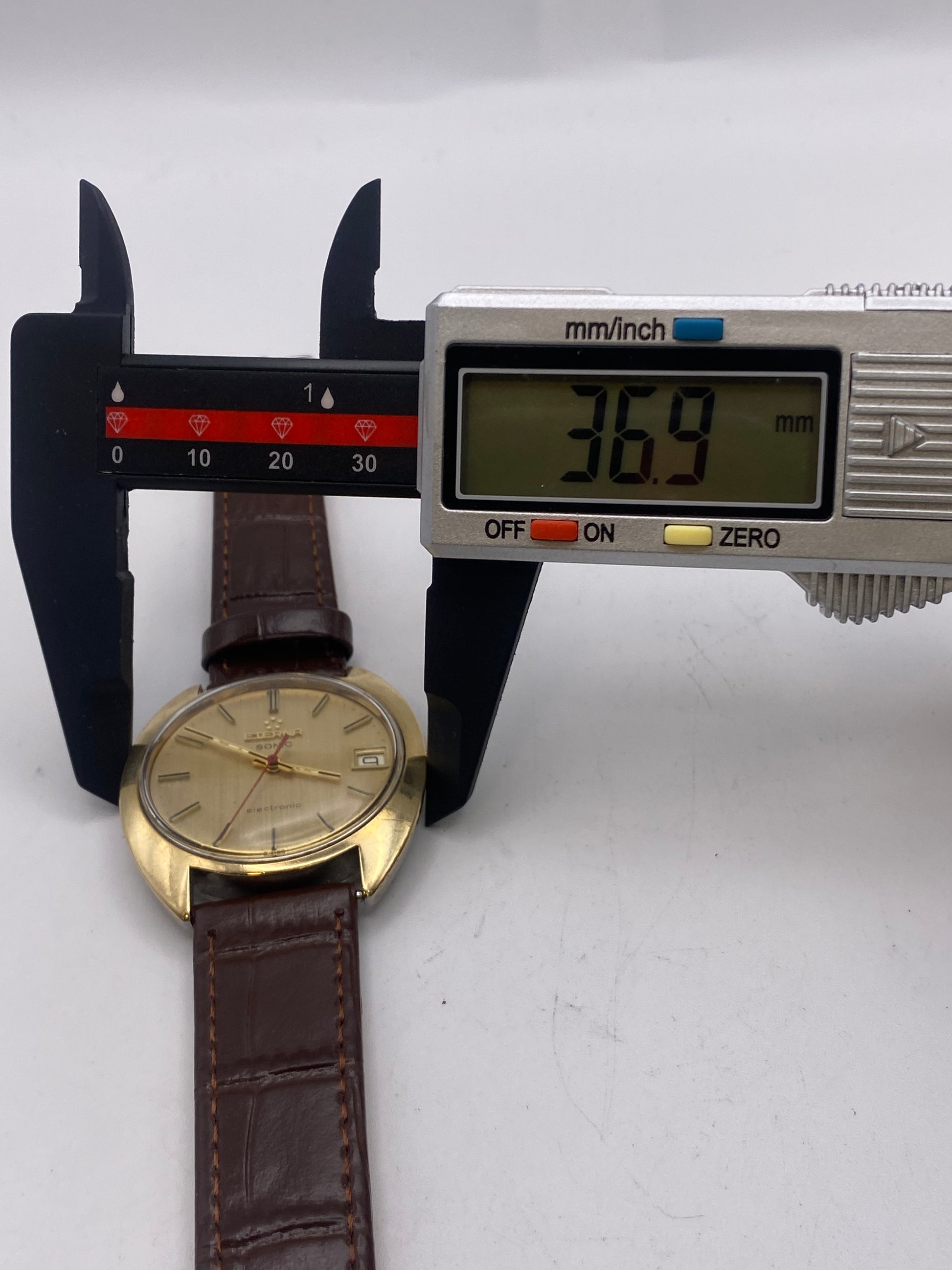 Now available is this stunning vintage Eterna Sonic gents dress watch. This watch features a beautiful gold tone dial with gold tone hands and indexes. It has a tuning fork movement that has been time-tested and is running exceptionally well. As you can see, the case and glass have some slight marks, but nothing that compromises the watch's wearability or structure. This watch is not sold as water-resistant; keep it away from water.