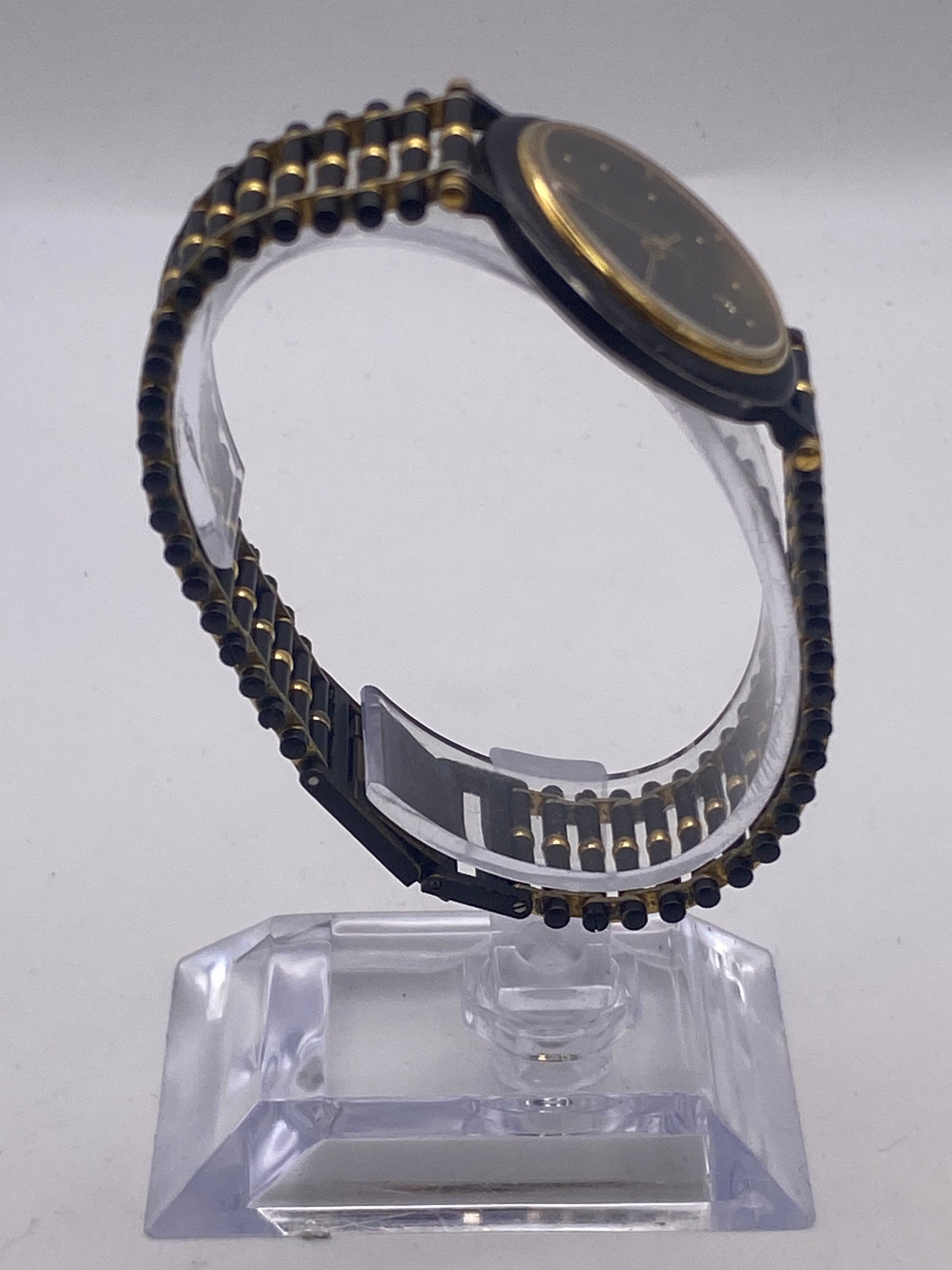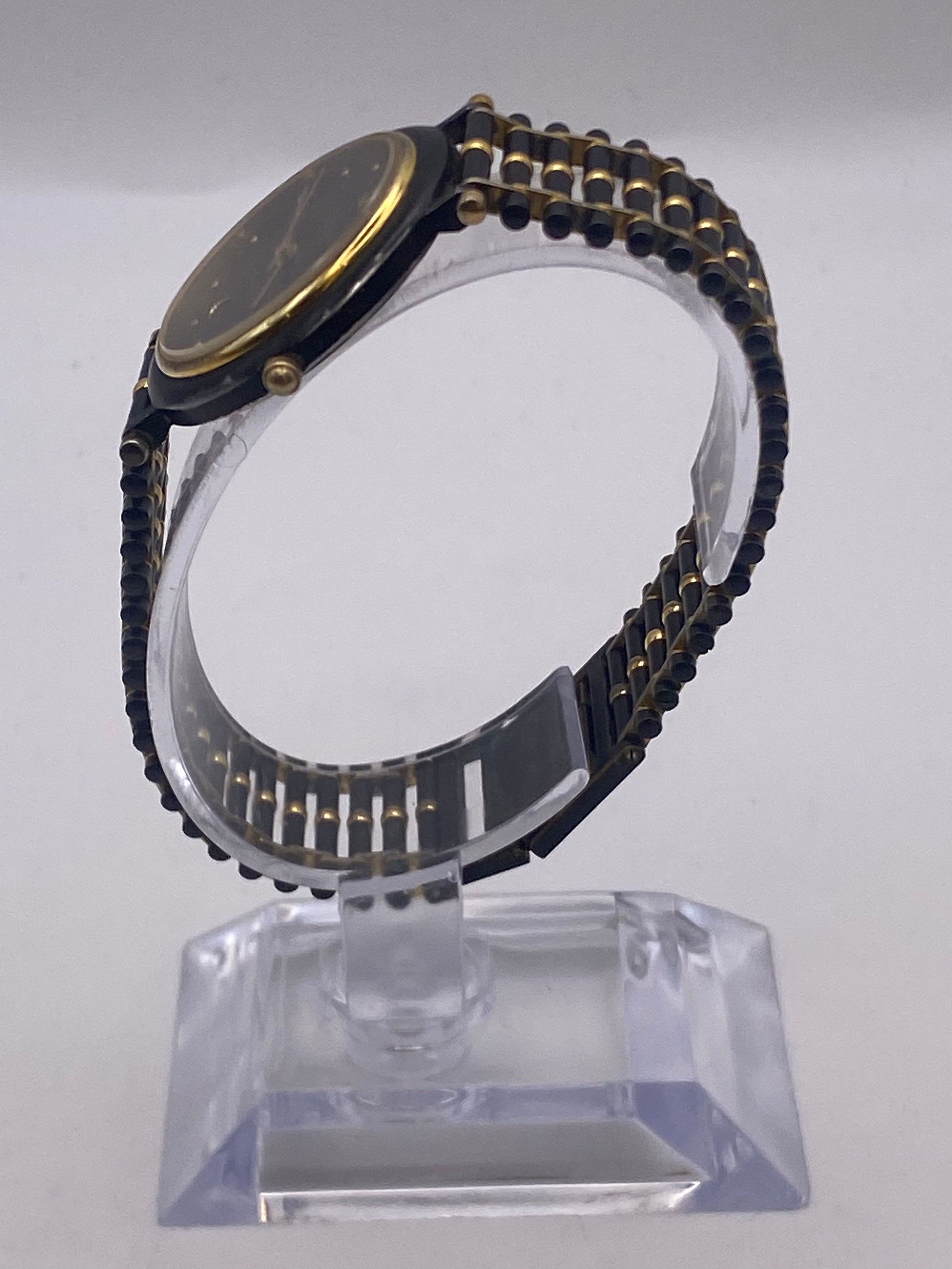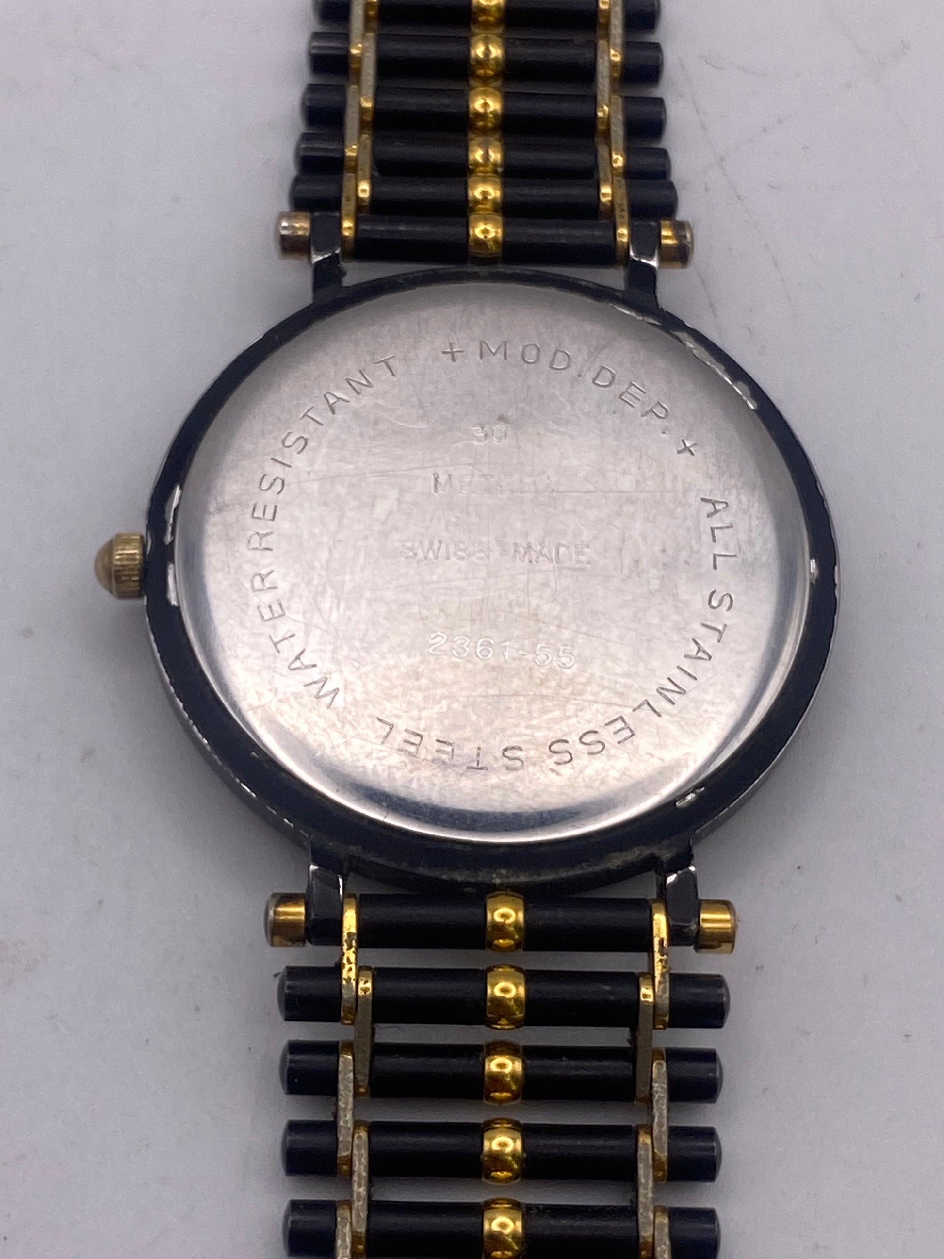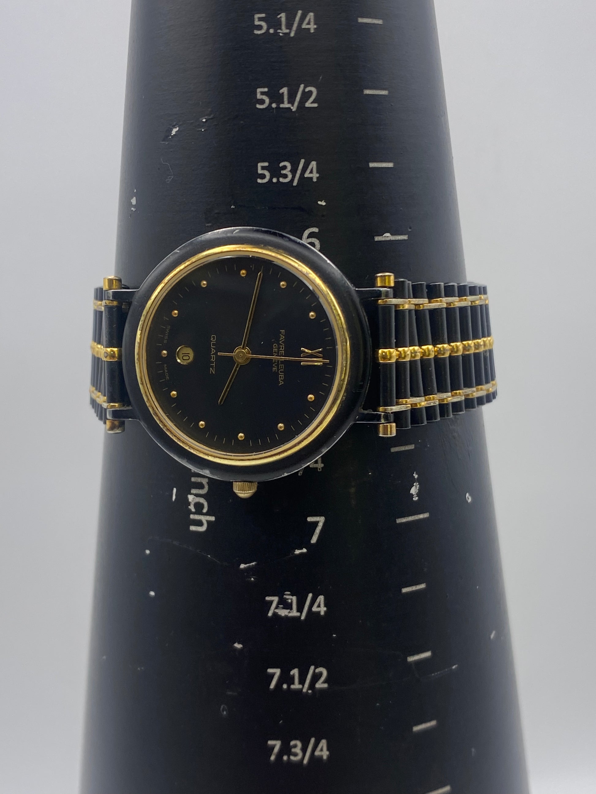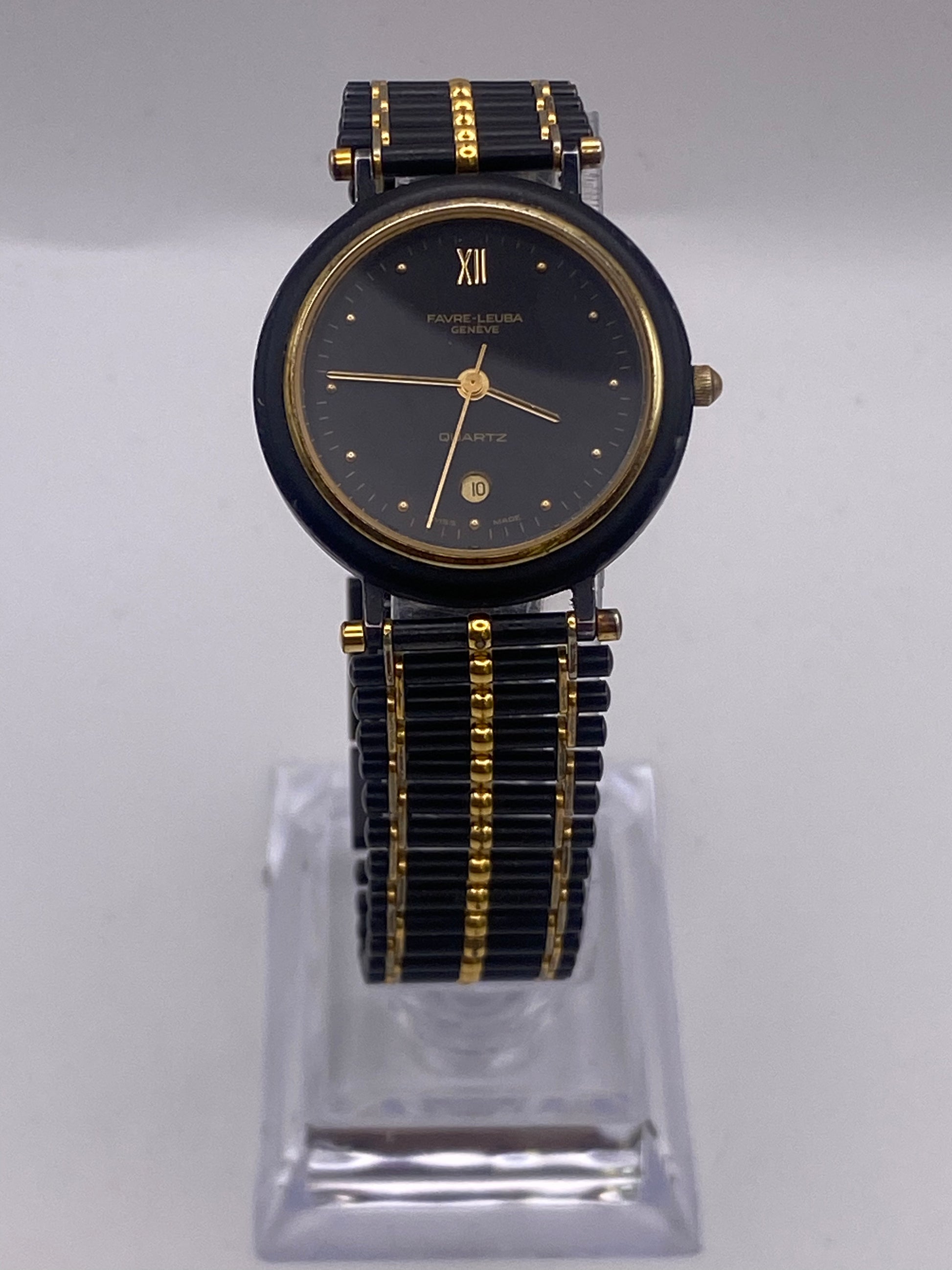 Now available is this vintage Favre-Leuba dress watch. This watch features a stunning black dial with gold tone hands and indexes. It has a quartz movement that has been time-tested and is running exceptionally well. As you can see, the case and glass have some slight marks, but nothing that compromises the watch's wearability or structure. This watch is not sold as water-resistant; keep it away from water. PLEASE NOTE THIS WATCH HAS AN ISSUE WHERE THE DATE DOES NOT LINE UP WITH THE WINDOW THIS IS REFLECTED IN PRICE.
