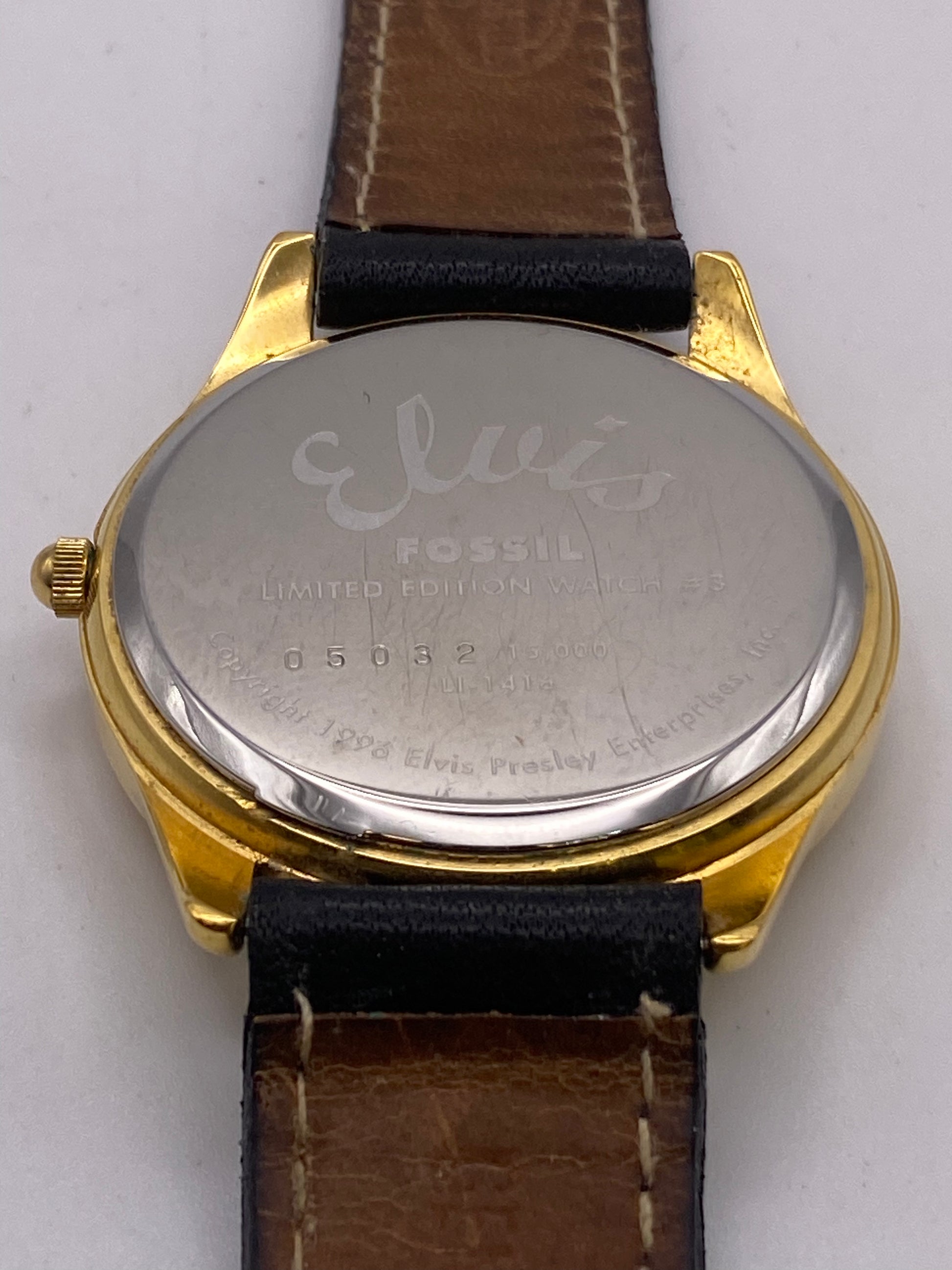 Now available is this striking gents Fossil Elvis quartz dress watch. This watch features a beautiful two tone dial with gold tone hands. It has a quartz movement that has been time-tested and is running exceptionally well. As you can see, the case and glass have some slight marks, but nothing that compromises the watch's wearability or structure. This watch is not sold as water-resistant; keep it away from water.
