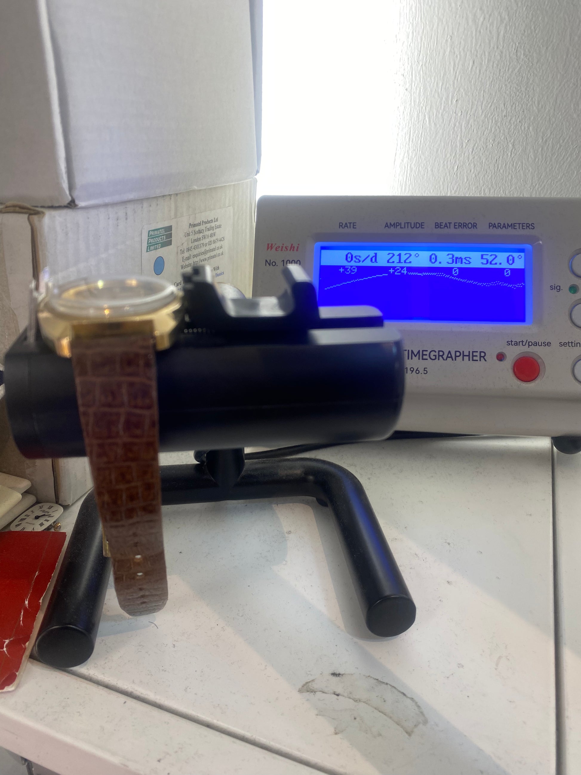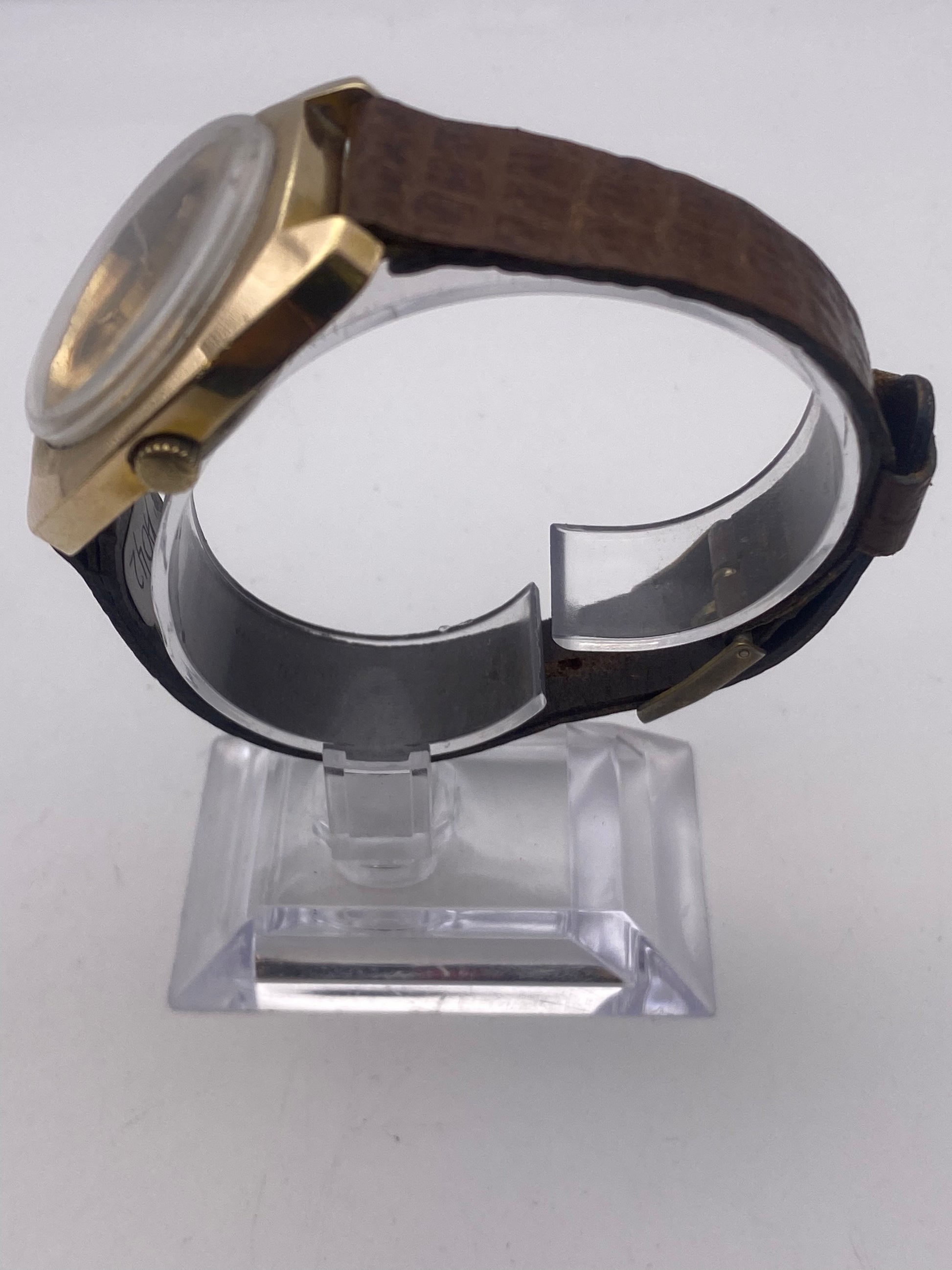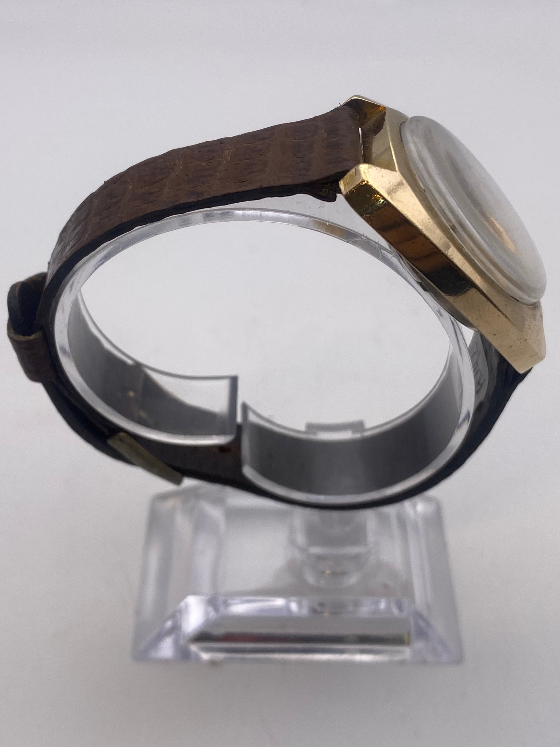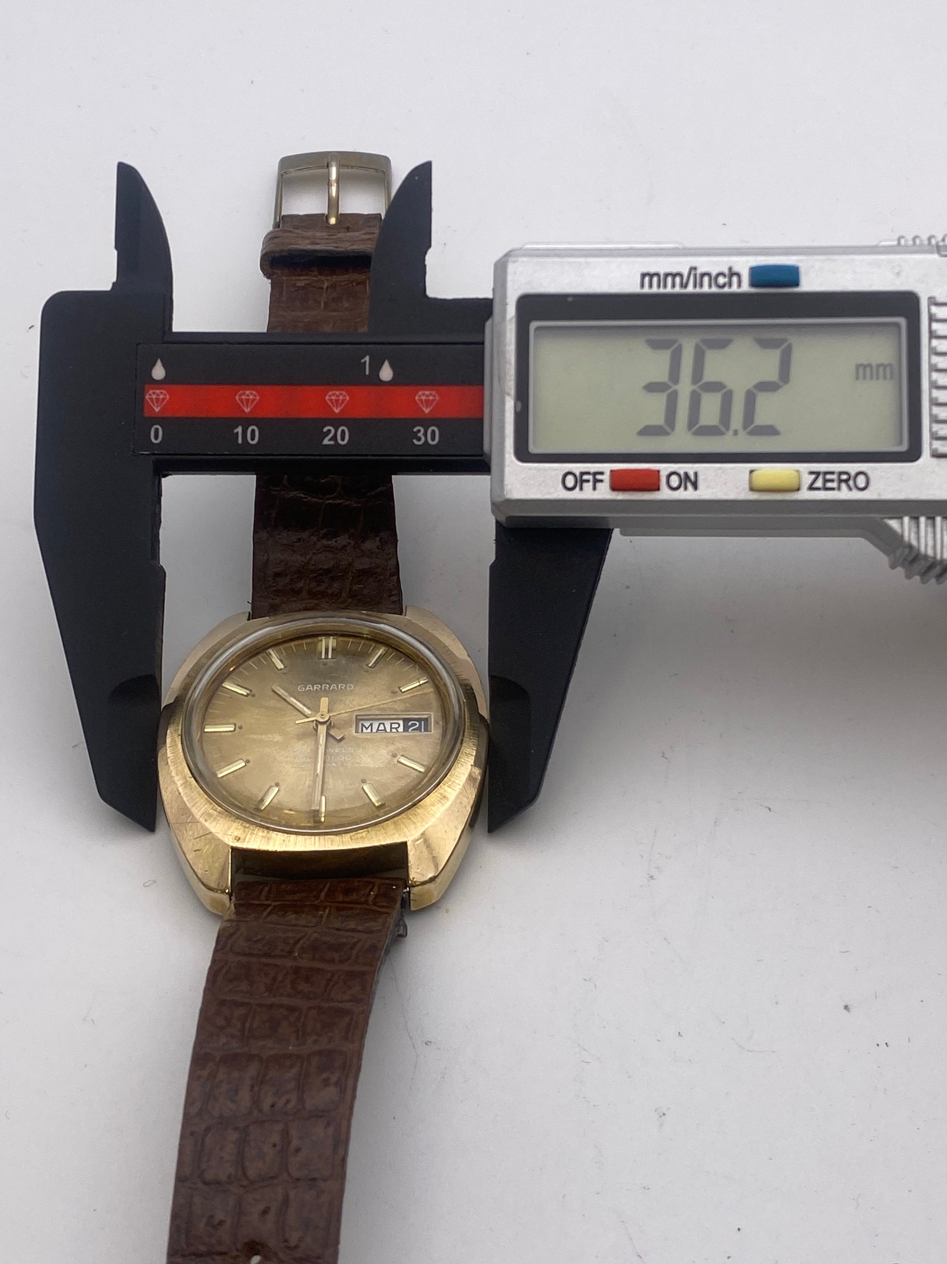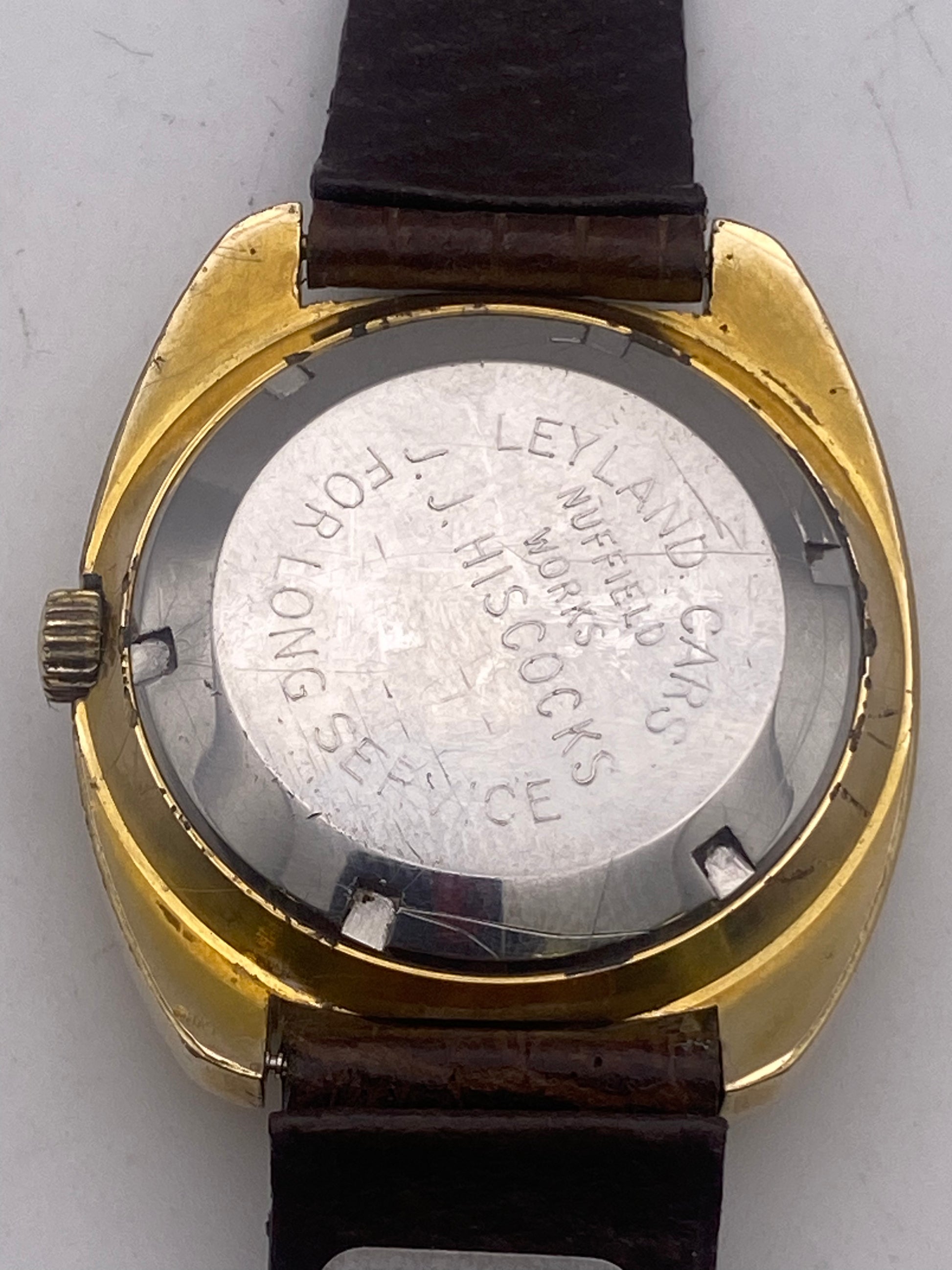 Now available is this Garrard gents gold-plated dress watch, gifted by Leyland Cars for long service to an employee. This watch has a gold-tone dial with gold-tone baton hour markers and hands. It has an automatic mechanical movement that has been time-tested and is running well. The watch features a day and date function located at the 3 o’clock position. Please keep away from water, as this watch is no longer water-resistant