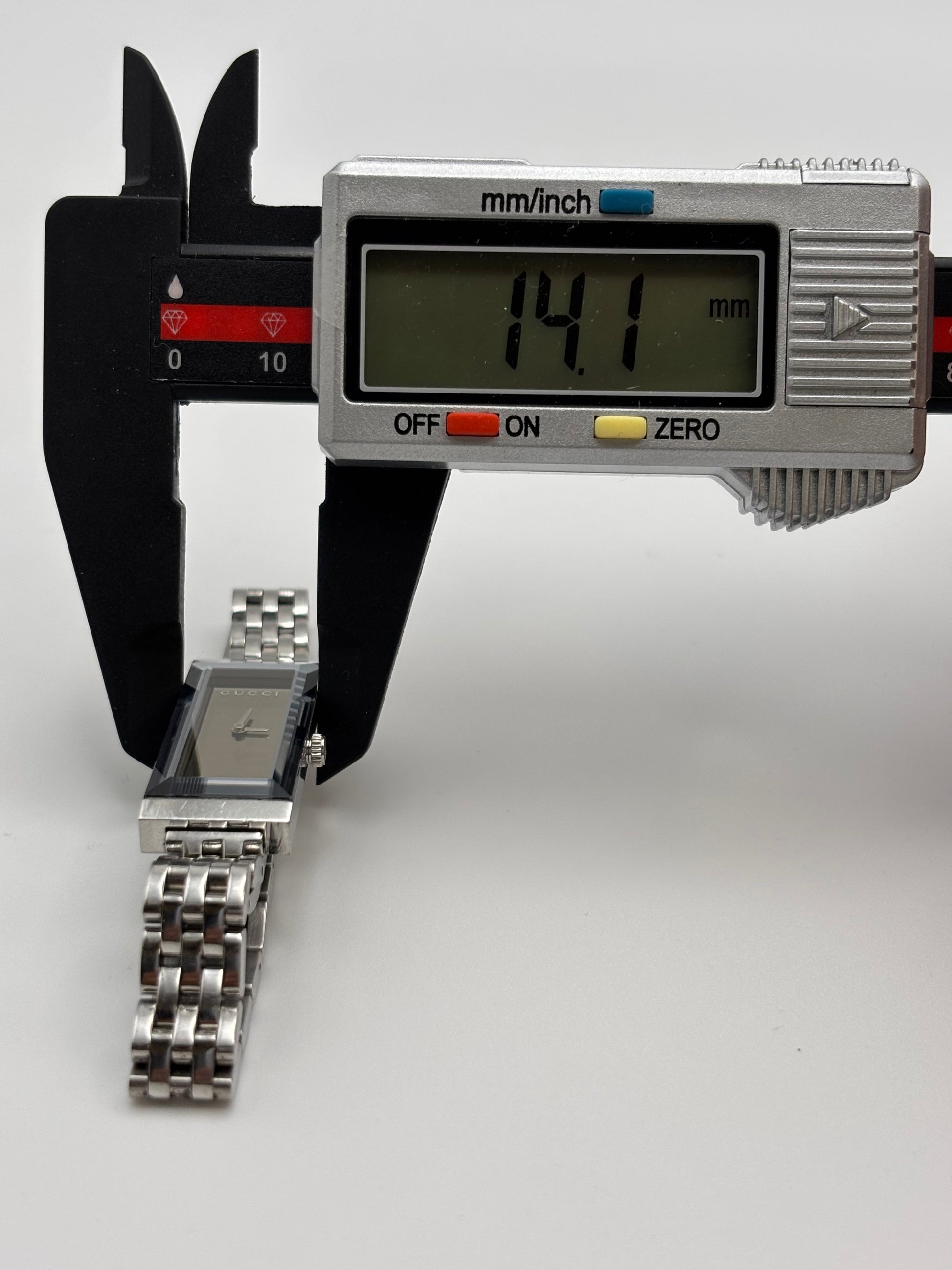 Now available is this Gucci Stainless Steel Ladies Dress Watch. This watch features a grey dial with an amazing gem cut crystal. It has a quartz movement that has been time-tested and is running exceptionally well.