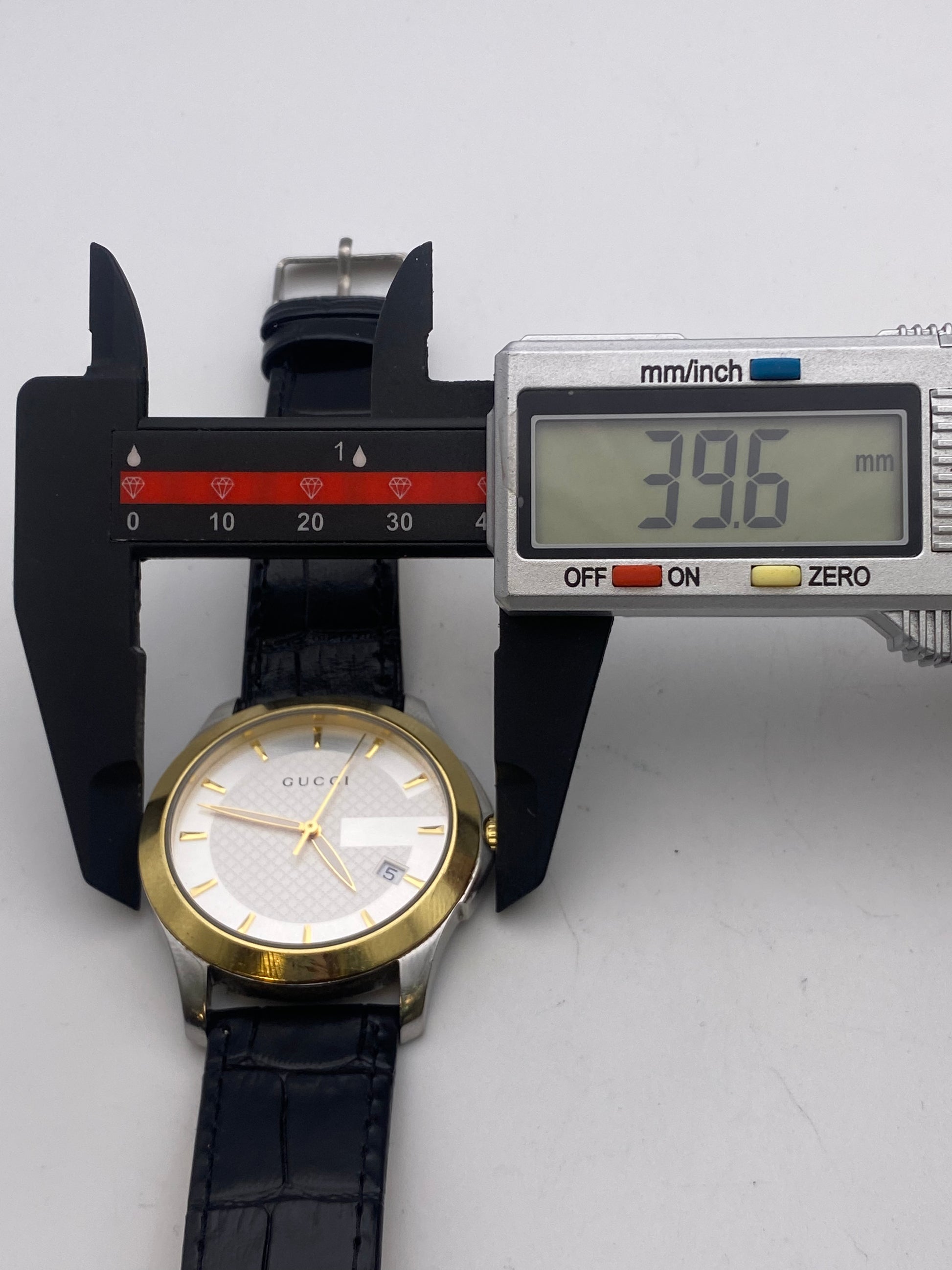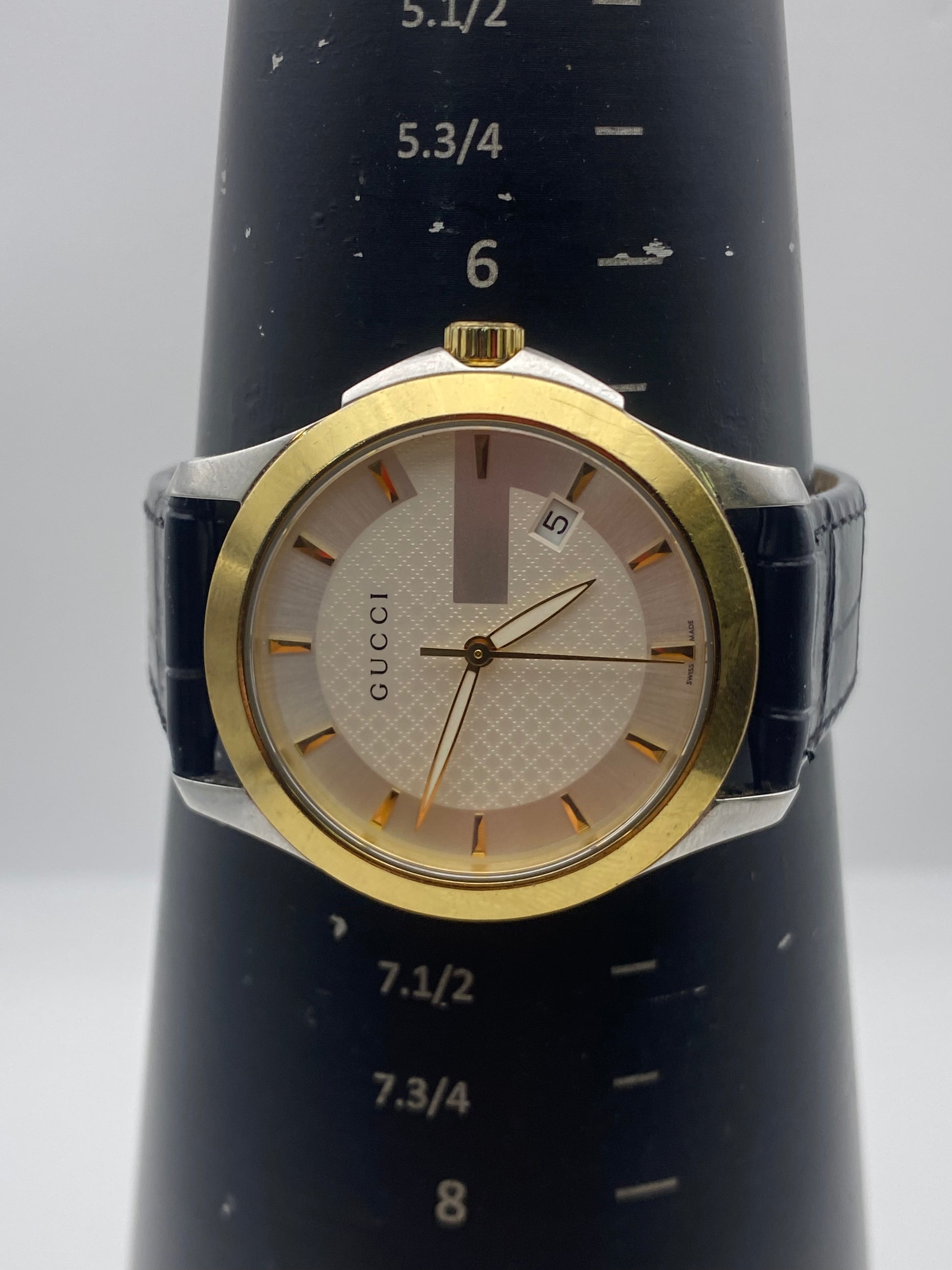 Now available is this stunning Gucci gents quartz dress watch. This watch features a beautiful silver tone dial with gold hands and indexes. It has a quartz movement that has been time-tested and is running exceptionally well. As you can see, the case and glass have some slight marks, but nothing that compromises the watch's wearability or structure. This watch is not sold as water-resistant; keep it away from water.