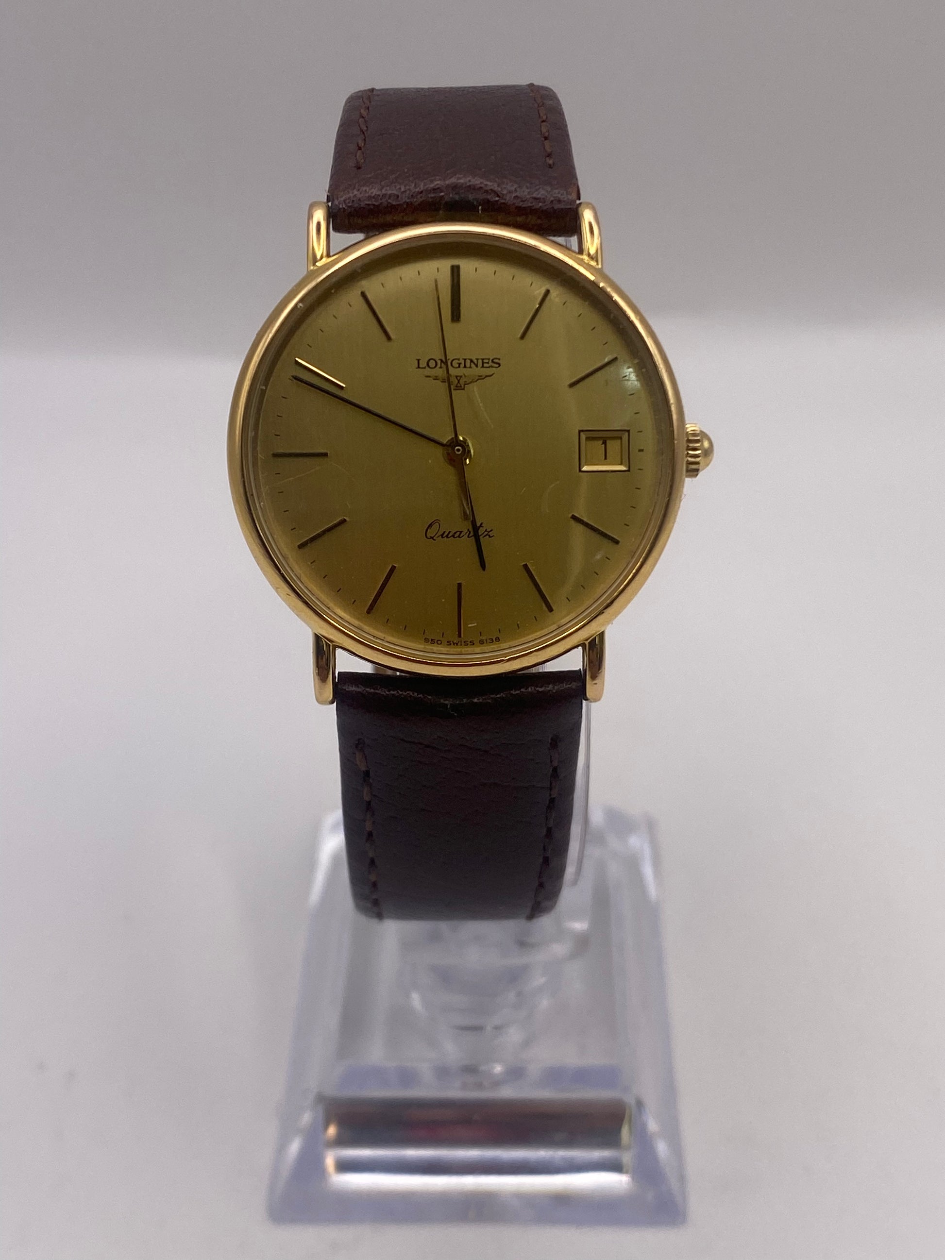 Now available is this stunning vintage Longines quartz dress watch. This watch features an exceptional gold tone dial with gold tone indexes and hands. It has a quartz movement that has been time-tested and is running exceptionally well. As you can see, the case and glass have some slight marks, but nothing that compromises the watch's wearability or structure. This watch is not sold as water-resistant; keep it away from water.