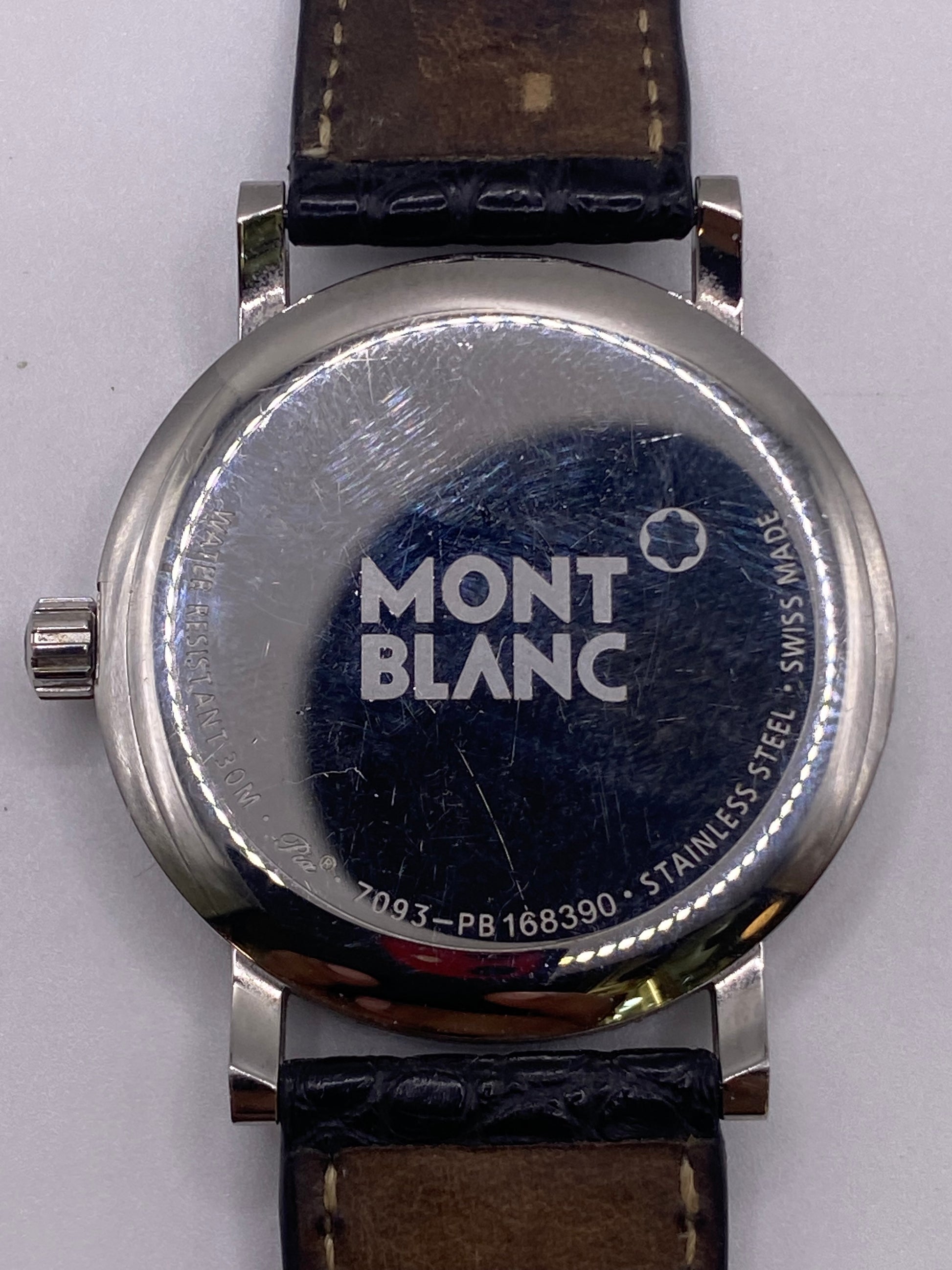 Now available is this Montblanc quartz stainless steel dress watch. This watch features a black dial with silver baton indexes and hands. It has a quartz movement that has been time-tested and is running exceptionally well. As you can see, the case and glass have some slight marks, but nothing that compromises the watch's wearability or structure. This watch is not sold as water-resistant; keep it away from water.