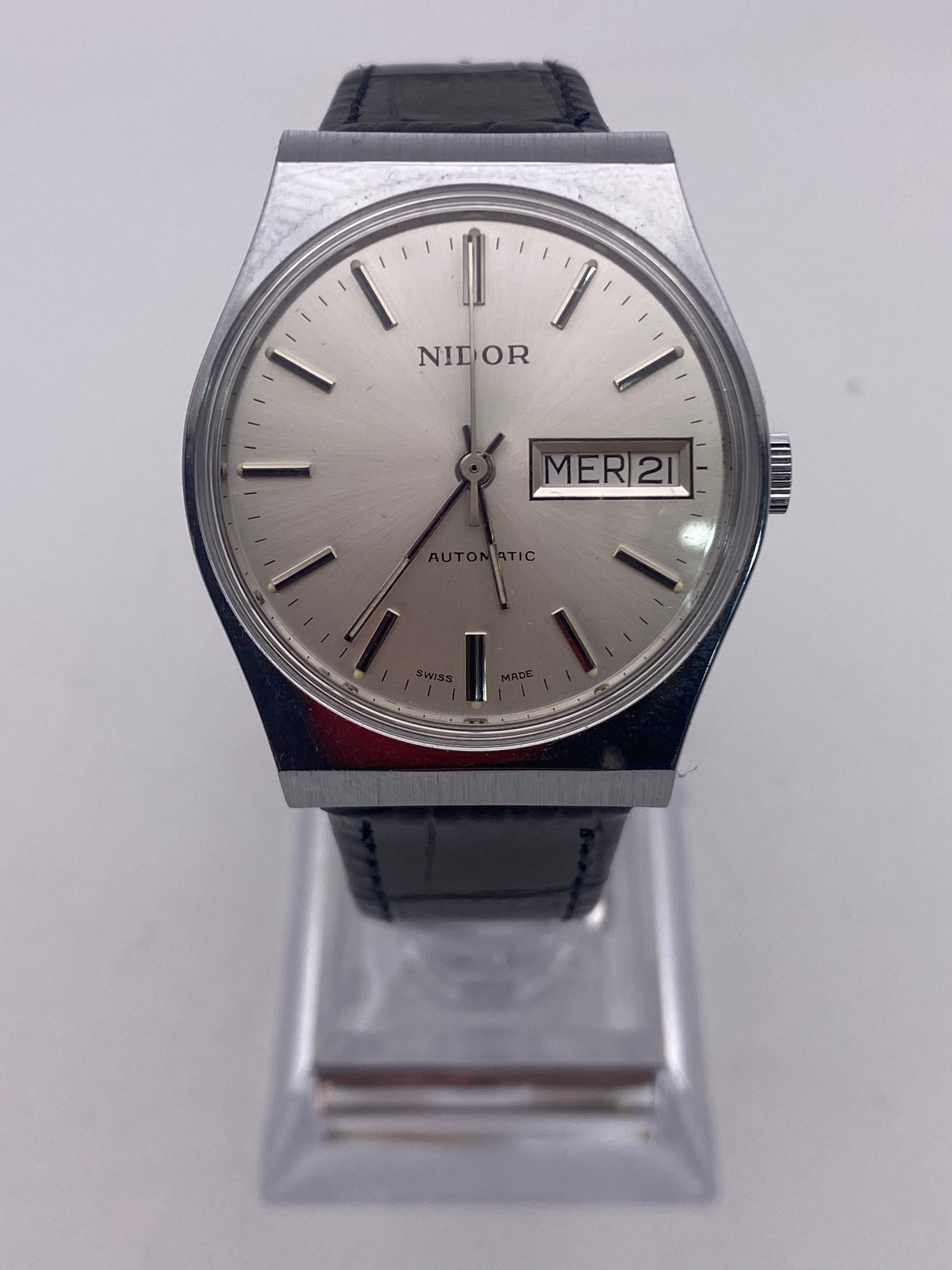 Now available is this completely unworn Nidor gents stainless steel dress watch. This watch has a silver tone dial with silver-tone baton hour markers. It has an automatic mechanical movement that has been time-tested and is running well. This watch features a day date function located at the 3 o'clock position, please note the date is displayed in French.