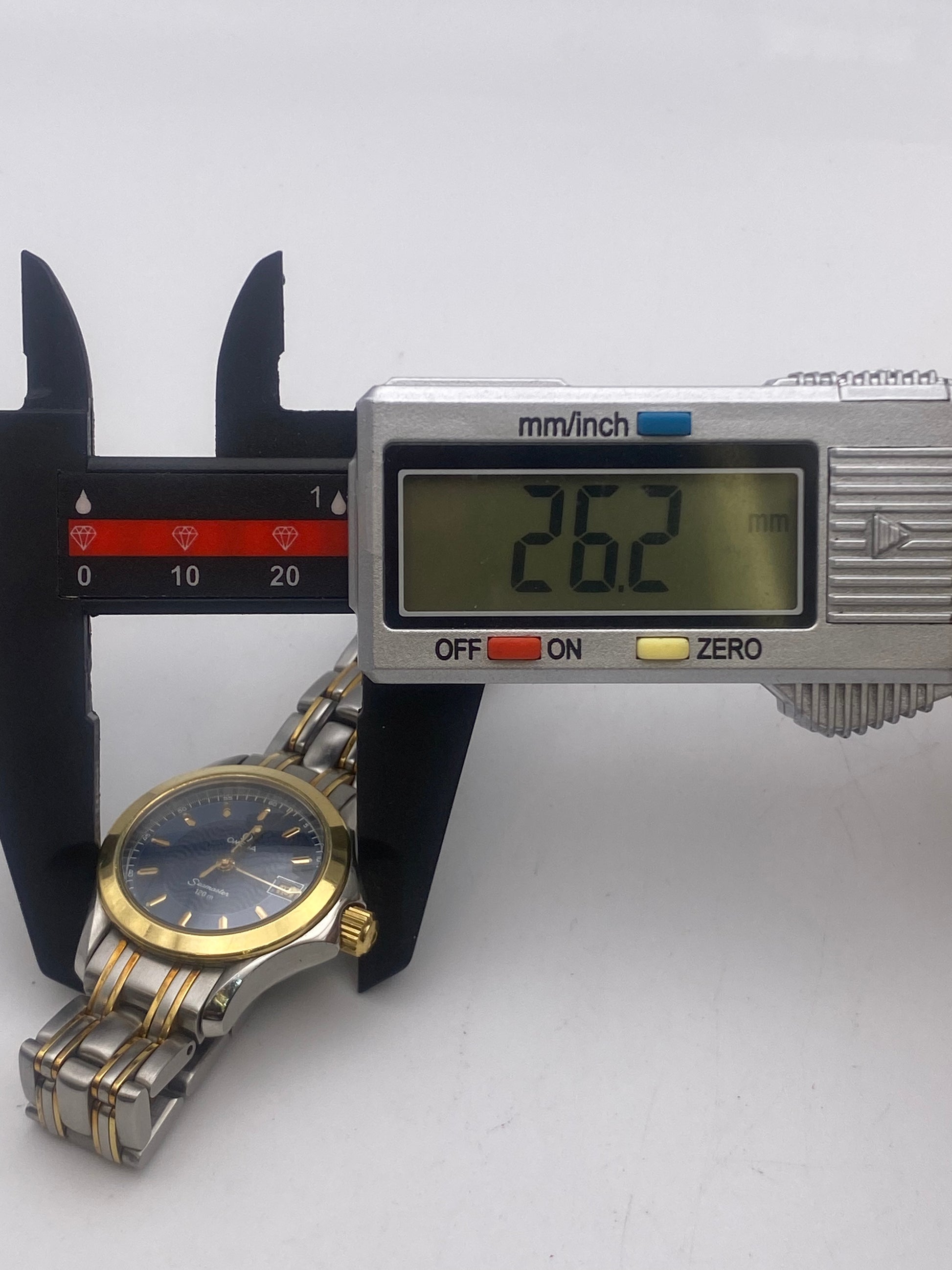 Now available is this stunning vintage ladies Omega Seamaster 120m quartz dress watch. This watch features an exceptional blue dial with striking gold tone hands. It has a quartz movement that has been time-tested and is running exceptionally well. As you can see, the case and glass have some slight marks, but nothing that compromises the watch's wearability or structure. This watch is not sold as water-resistant; keep it away from water.