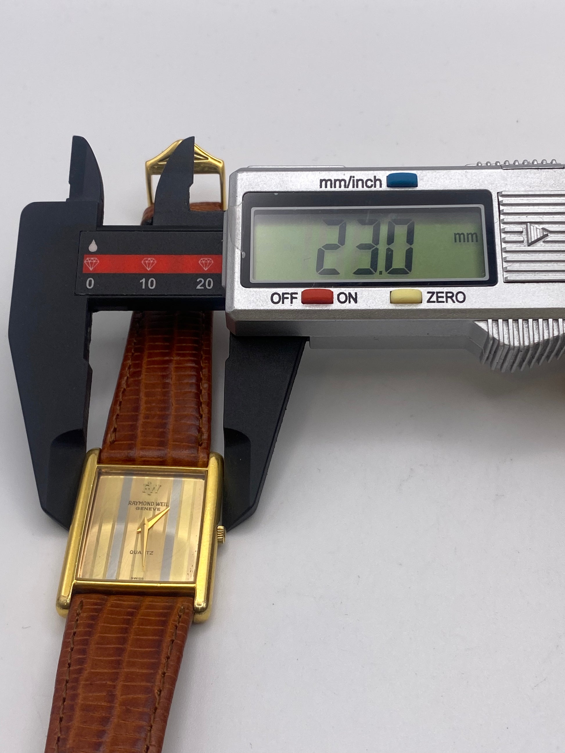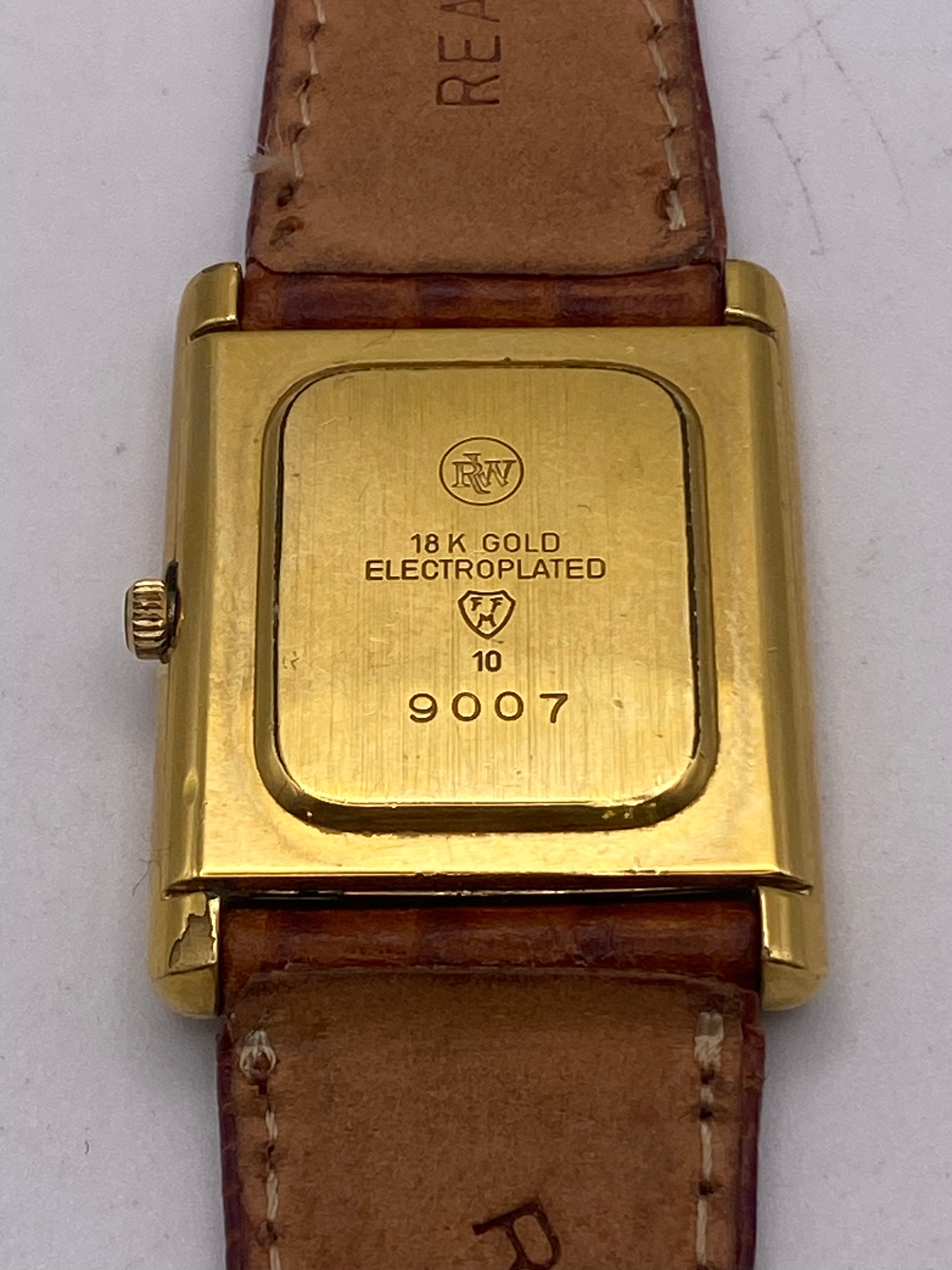 Now available is this stunning Raymond Weil tank dress watch. This watch features a beautiful tri tone dial with gold tone hands. It has a quartz movement that has been time-tested and is running exceptionally well. As you can see, the case and glass have some slight marks, but nothing that compromises the watch's wearability or structure. This watch is not sold as water-resistant; keep it away from water.