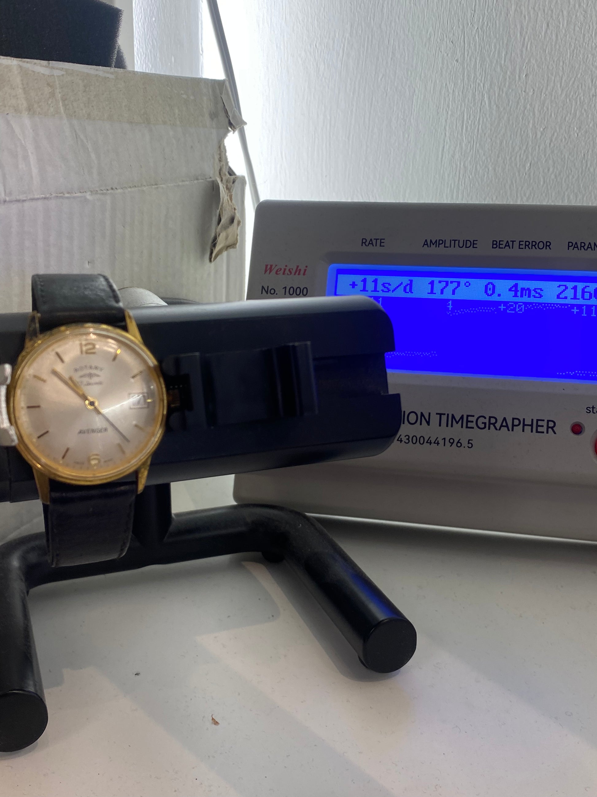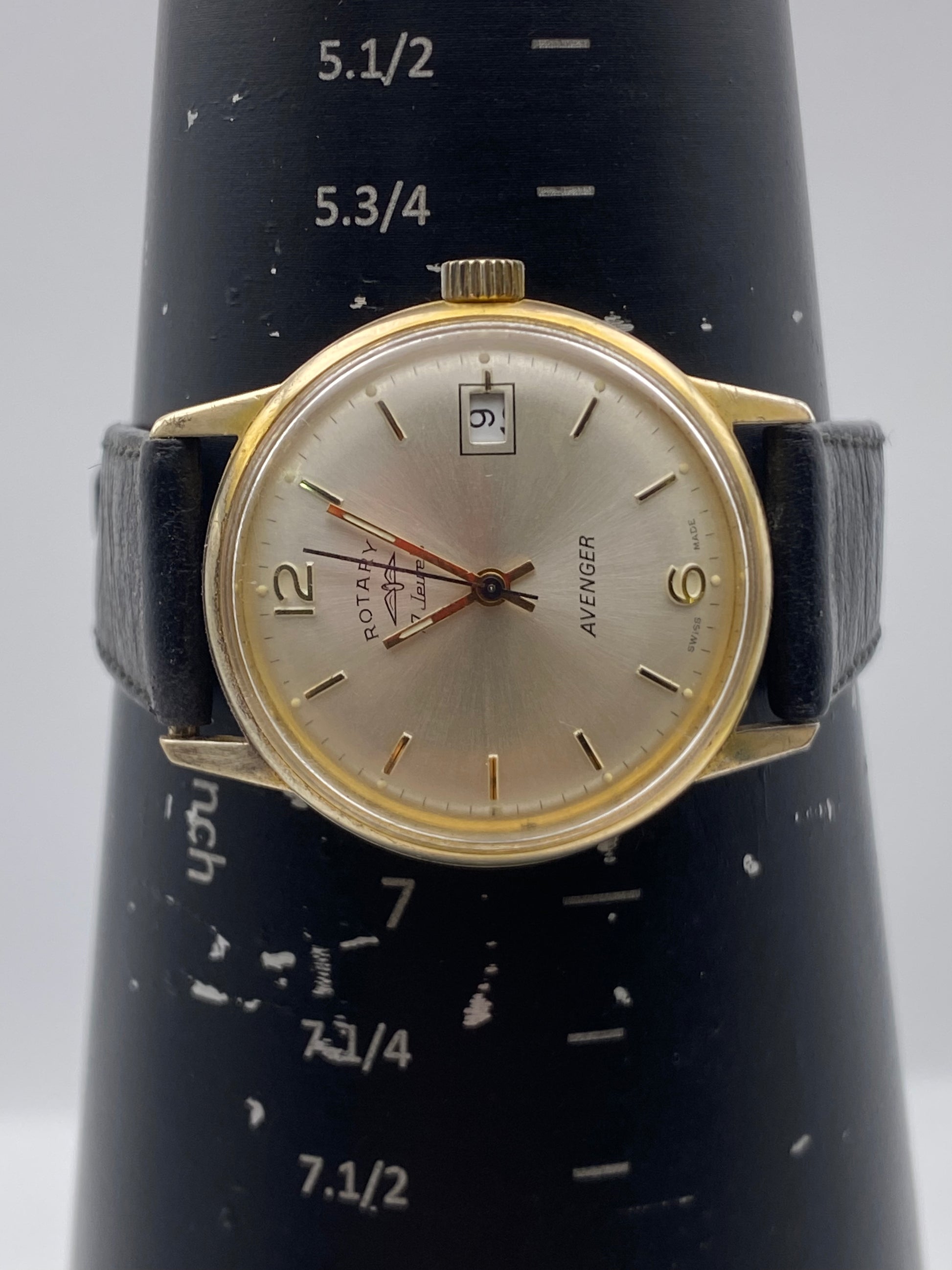 Now available is this stunning vintage Rotary Avenger manual wind mechanical gents dress watch. This watch has a striking silver dial with gold tone hour markers. It has a manual wind mechanical movement that has been time-tested and is running well. As you can see, the case and glass have some slight marks, but nothing that compromises the watch's wearability or structure. This watch is not water-resistant; keep it away from water. This watch is mechanical so will not be as accurate as a modern day quartz watch or smartphone.