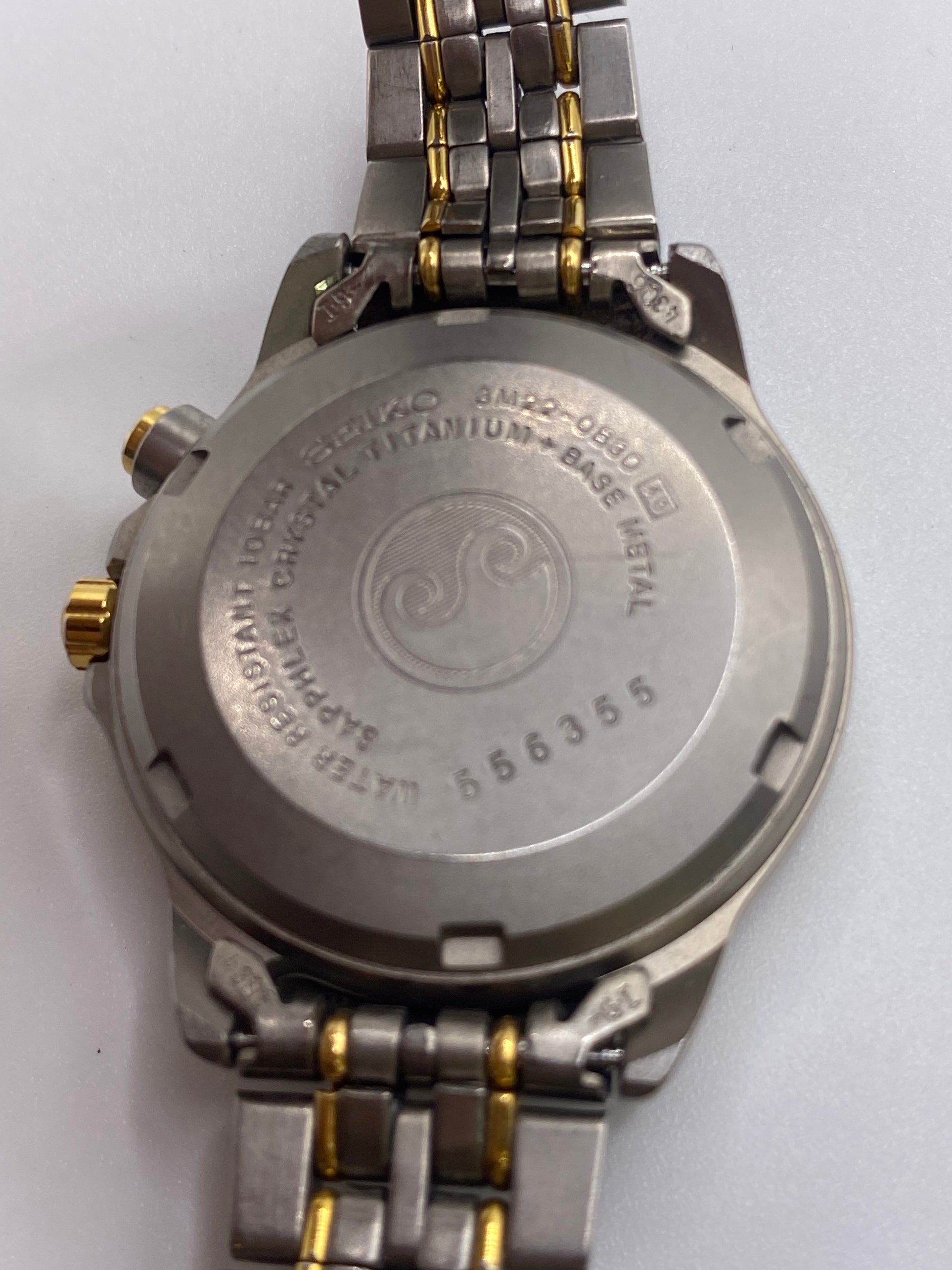 Now available is this Seiko kinetic titanium sports watch. This watch features an unusual grey dial with gold tone baton indexes hands. It has a quartz kinetic movement that has been time-tested and is running exceptionally well. As you can see, the case and glass have some slight marks, but nothing that compromises the watch's wearability or structure. This watch is not sold as water-resistant; keep it away from water.