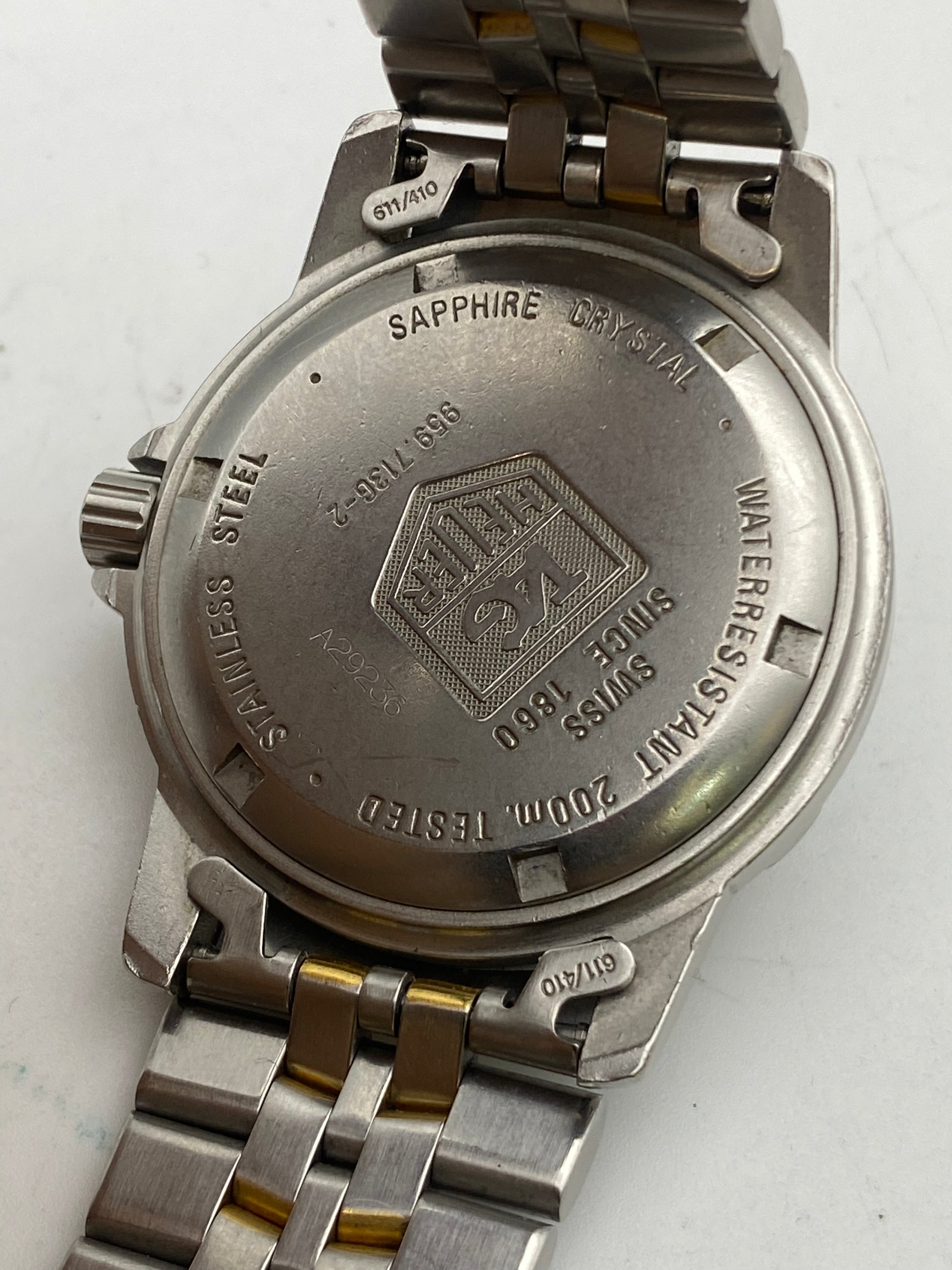 Now available is this stunning Tag Heuer two tone gents quartz sports watch. This watch features a beautiful white dial with black hands and lume filled indexes. It has a quartz movement that has been time-tested and is running exceptionally well. As you can see, the case and glass have some slight marks, but nothing that compromises the watch's wearability or structure. This watch is not sold as water-resistant; keep it away from water.