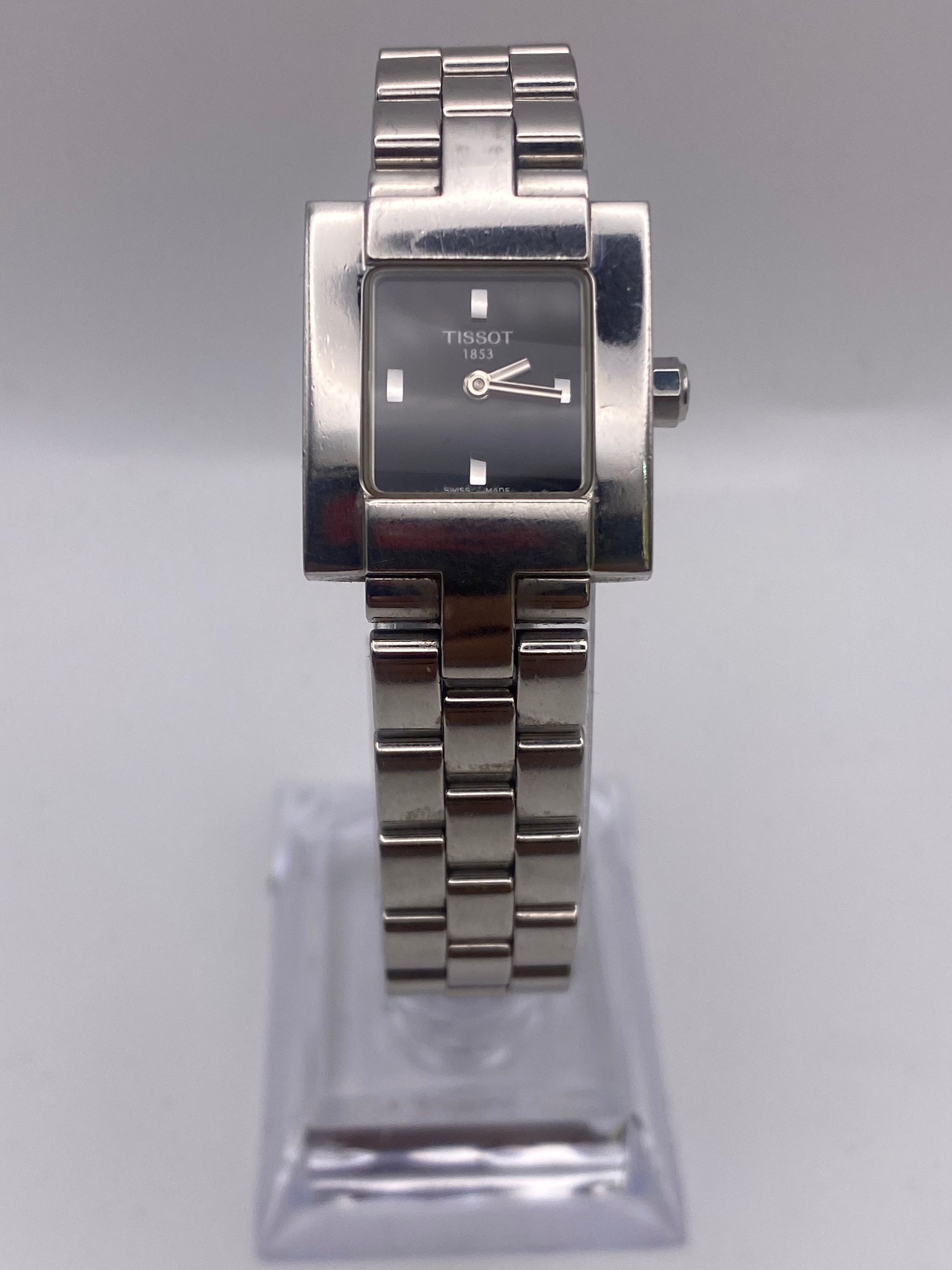 Now available is this Tissot ladies stainless steel dress watch. This watch features a stunning black dial with silver tone hands. It has a quartz movement that has been time-tested and is running exceptionally well. As you can see, the case and glass have some slight marks, but nothing that compromises the watch's wearability or structure. This watch is not sold as water-resistant; keep it away from water.