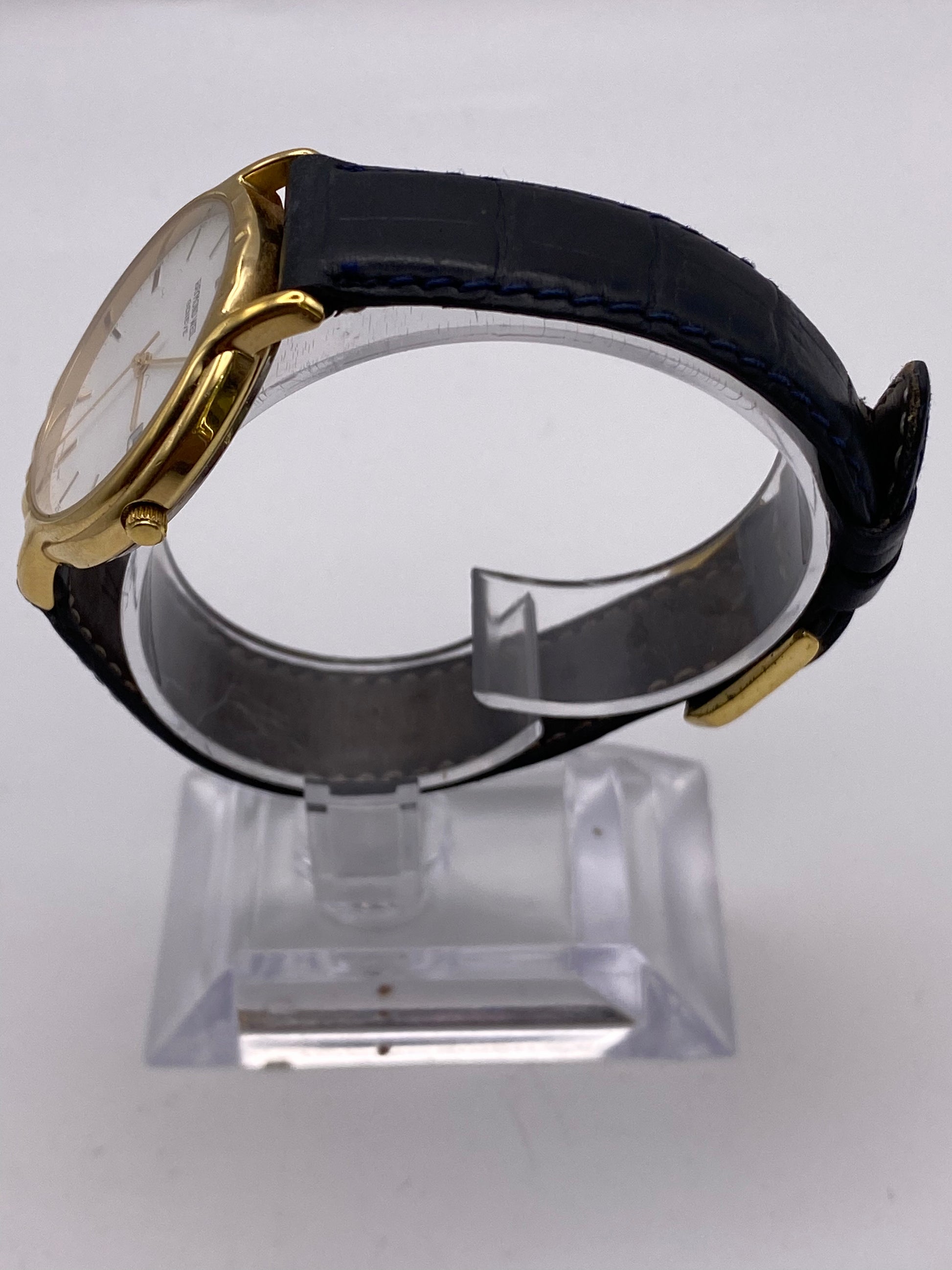 Now available is this striking gents Raymond Weil quartz dress watch. This watch features a beautiful white dial with gold tone indexes and hands. It has a quartz movement that has been time-tested and is running exceptionally well. As you can see, the case and glass have some slight marks, but nothing that compromises the watch's wearability or structure. This watch is not sold as water-resistant; keep it away from water.
