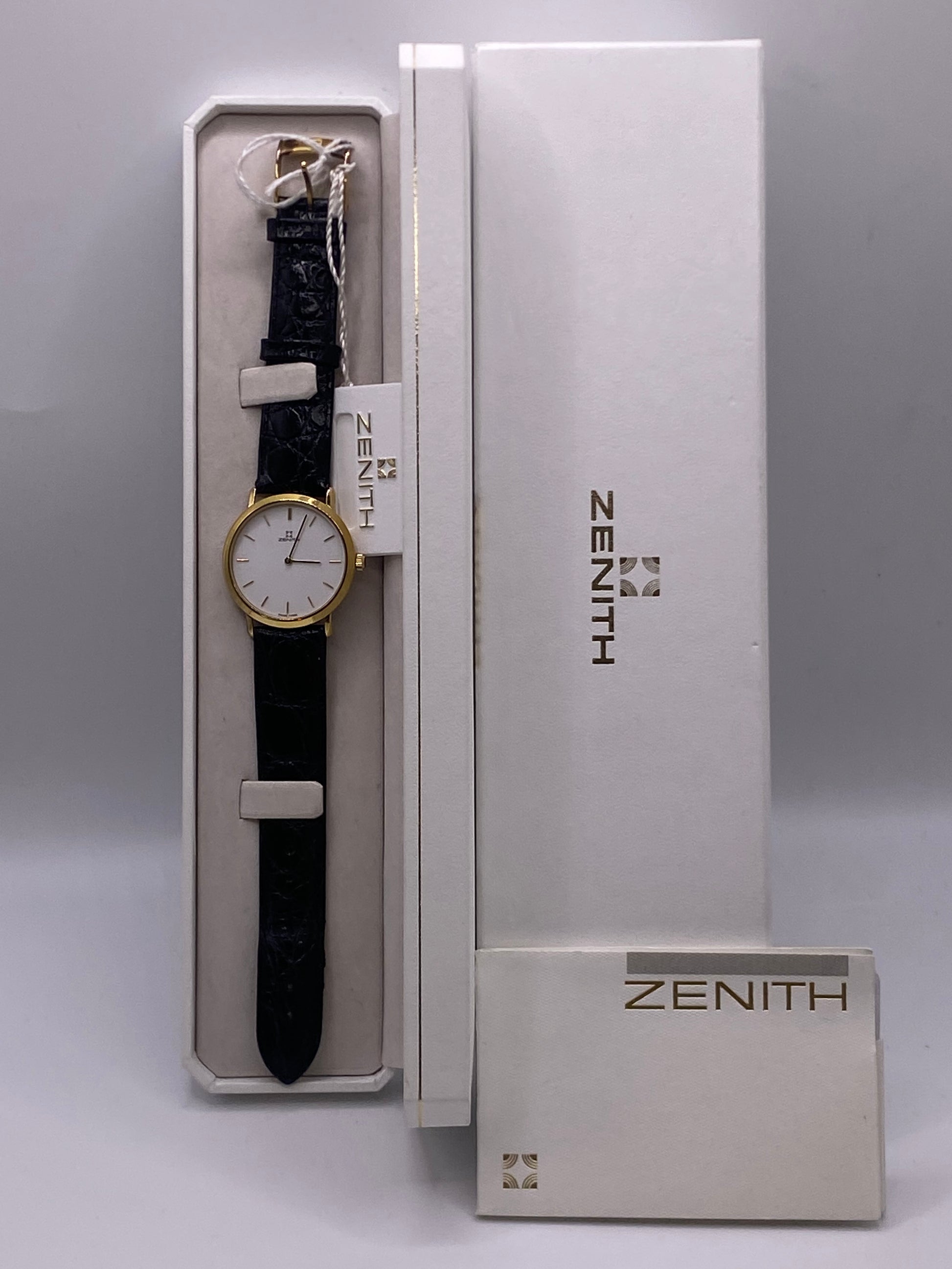 Now available is this Zenith quartz gold plated dress watch. This watch features a striking white dial with gold tone baton indexes and hands. It has a quartz movement that has been time-tested and is running exceptionally well. As you can see, the case and glass have some slight marks, but nothing that compromises the watch's wearability or structure. This watch is not sold as water-resistant; keep it away from water.
